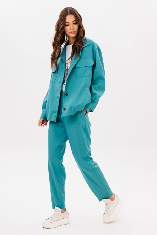 Свободный силуэт с заниженной линией плеча, рукав, расширенный в области оката, центральная застёжка на петли и пуговицы, стояче-отложной воротник.