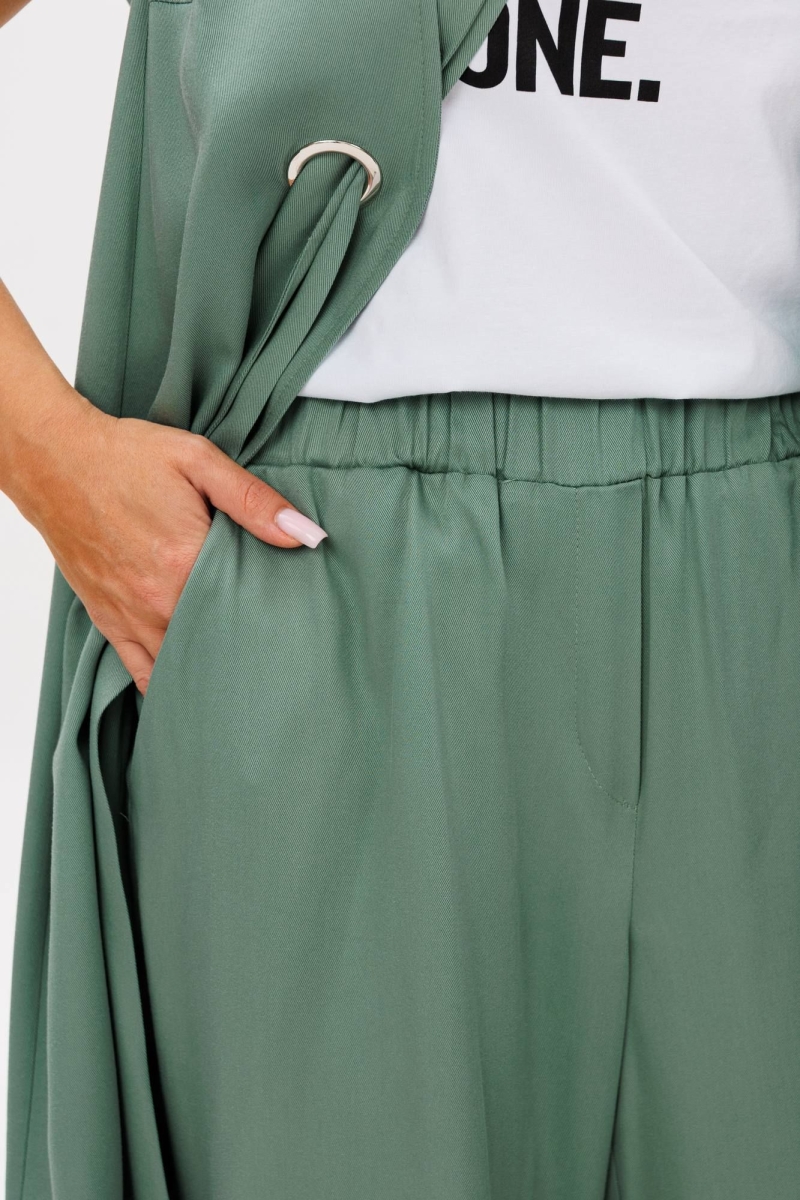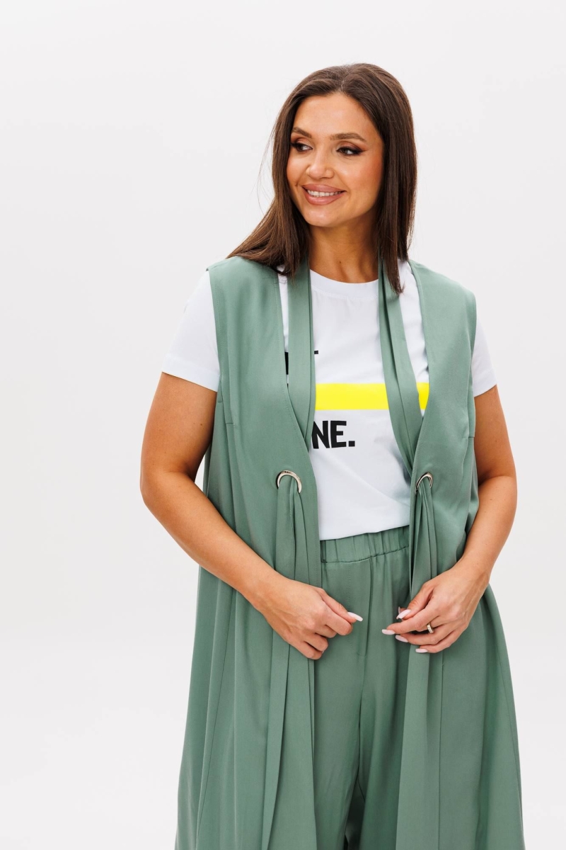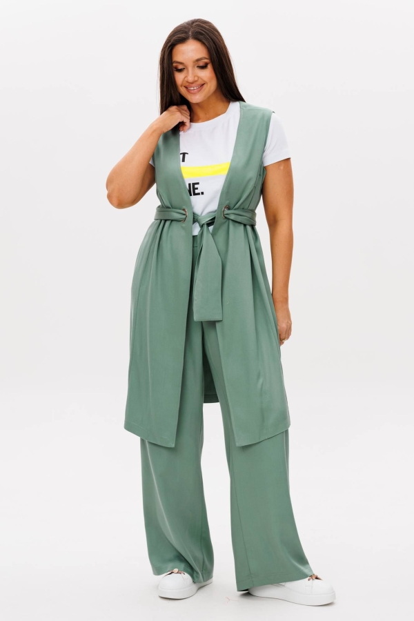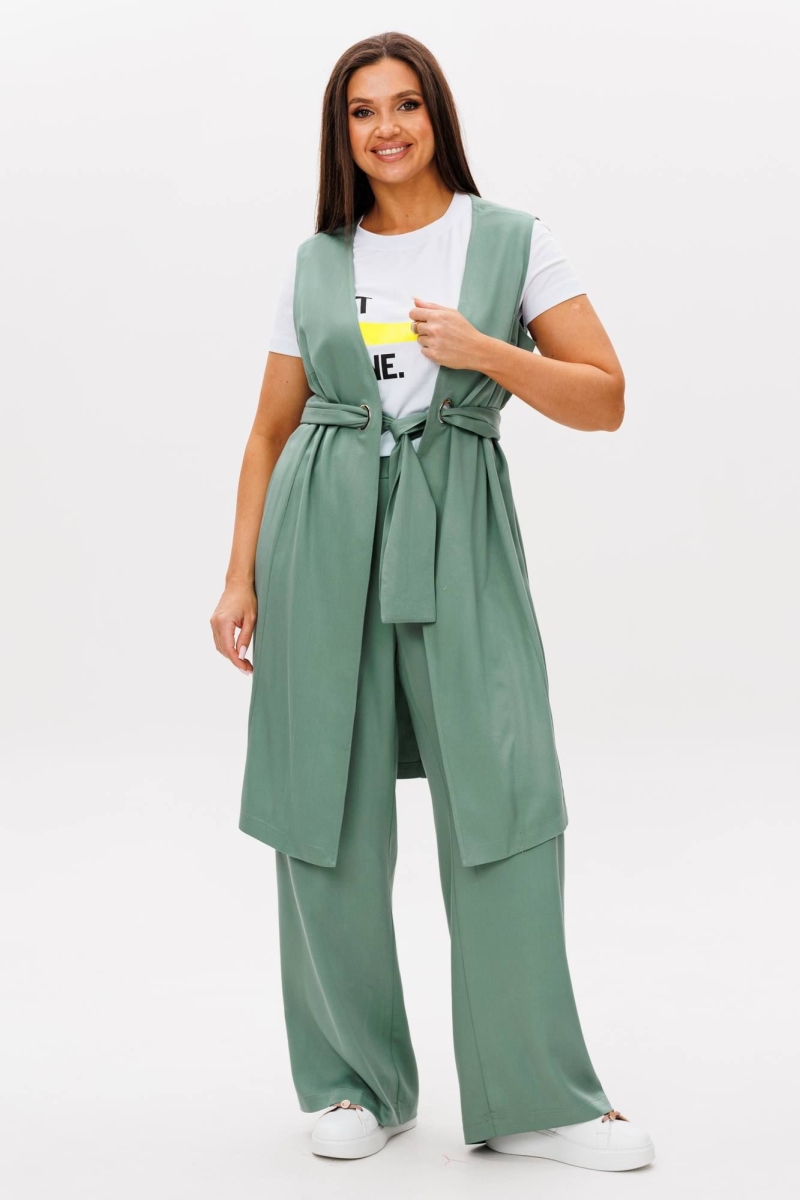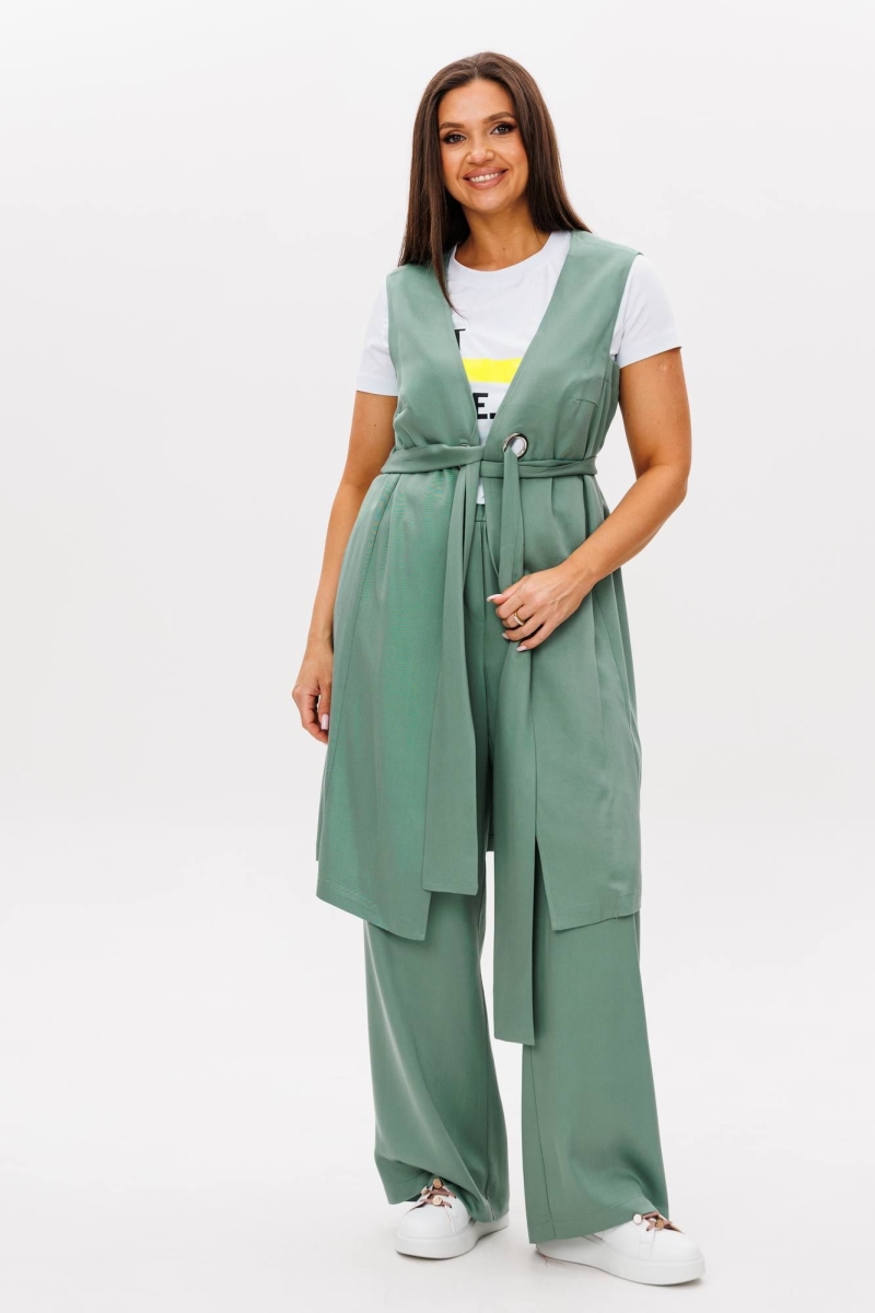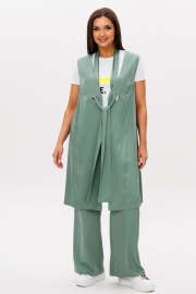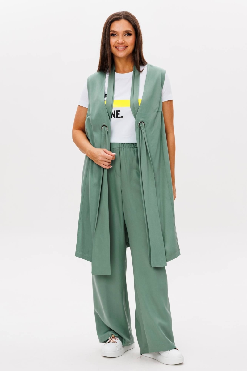 Комплекты в стиле кэжуал выбирает не только молодёжь: девушки в элегантном возрасте тоже ценят его за комфорт и индивидуальную свободу при создании своего образа. Уникальный симбиоз удобства и привлекательности. Свободный удлинённый жилет и комфортные брюки в расслабленном стиле. Жилет А-силуэта, без застёжки, с декоративными люверсами и отделочным шарфом. Полочка с боковым рельефом и нагрудной вытачкой. Спинка со средним швом и боковым рельефом. Брюки свободные, на эластичном поясе, с наклонными боковыми карманами. Длина жилета около 92 см. Длина брюк около 106 см.