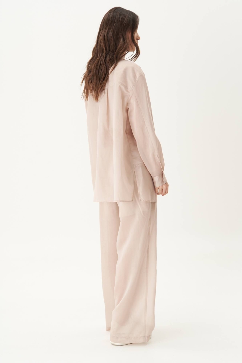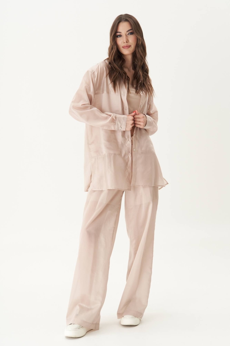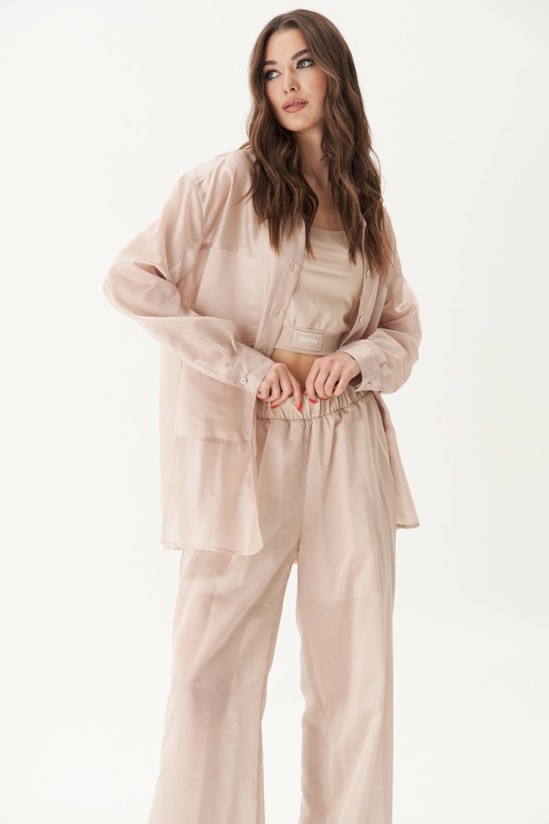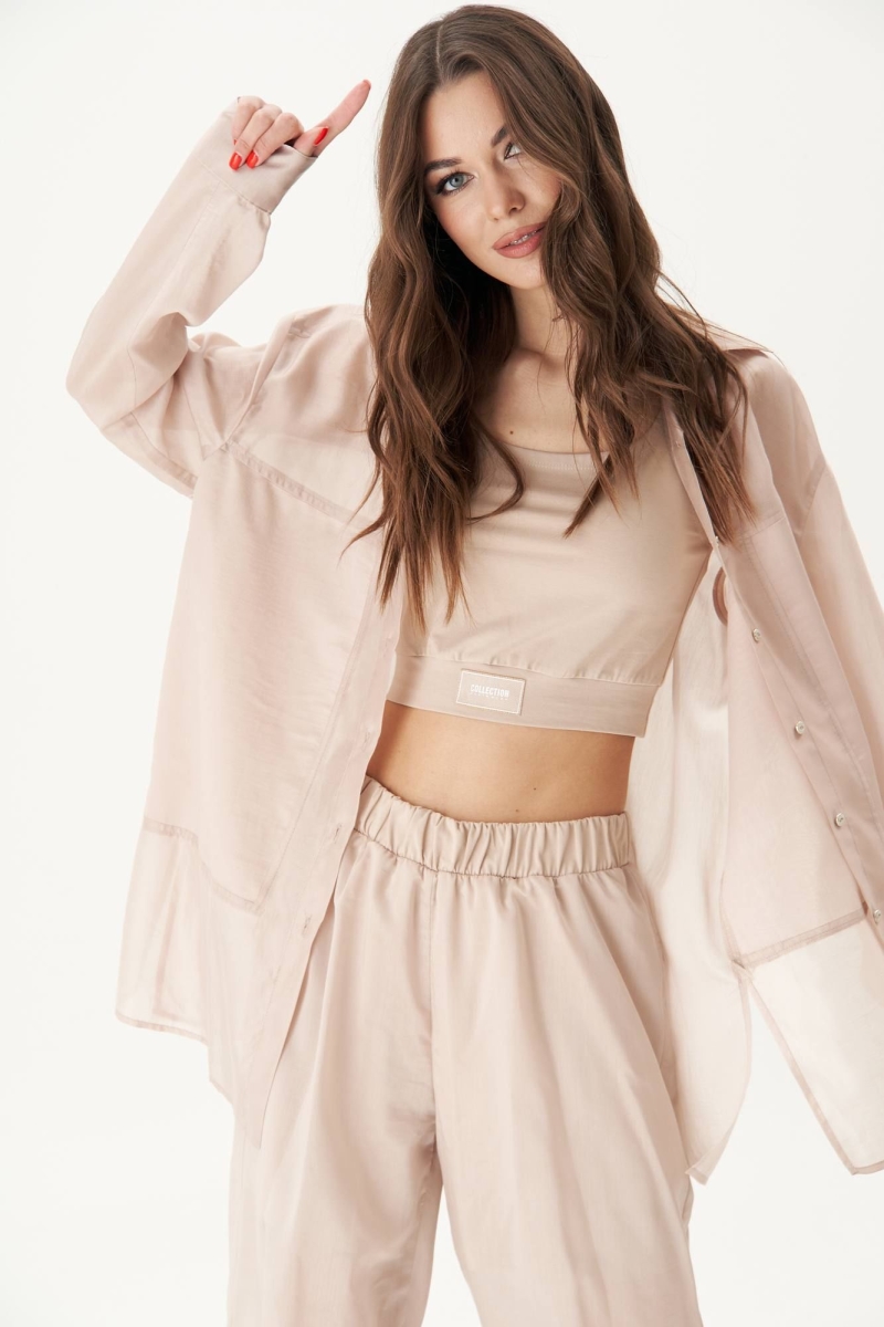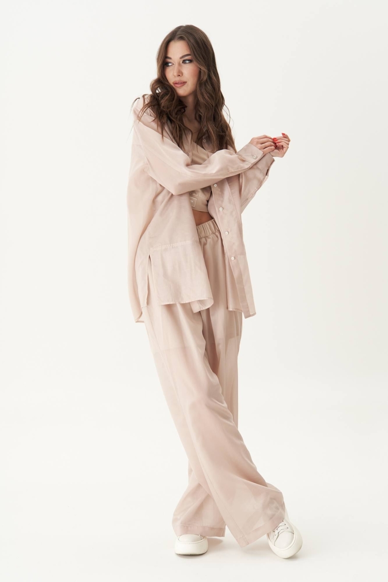 Свободная, невесомая рубашка, майка-топ и прозрачные брюки с эластичными шортами внутри.