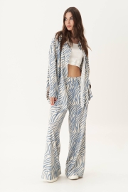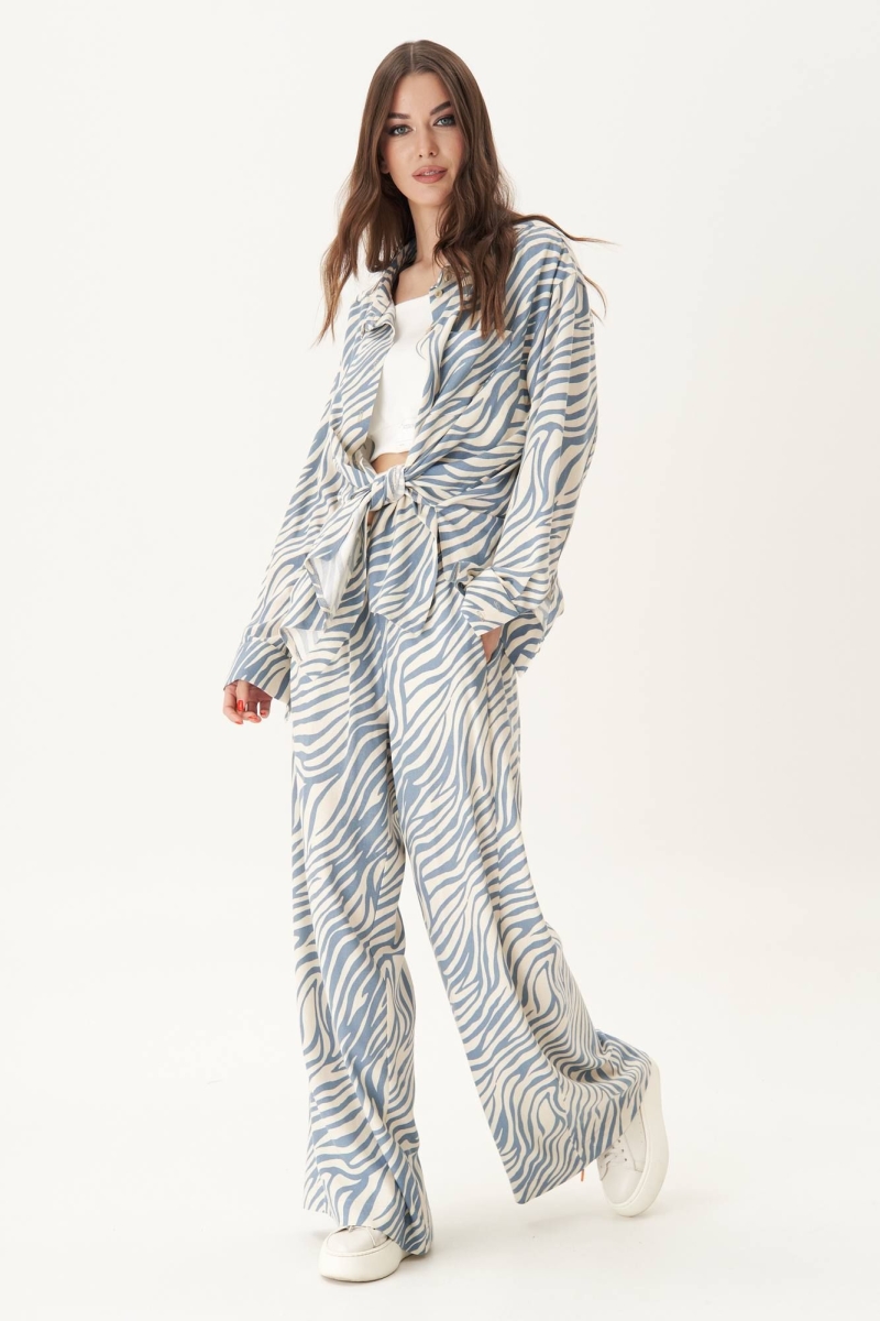 Прежде всего, его выделяет роскошная ткань с принтом animal, которая позволяет создать такой великолепный вариант брючного комплекта, который составит конкуренцию любому платью.