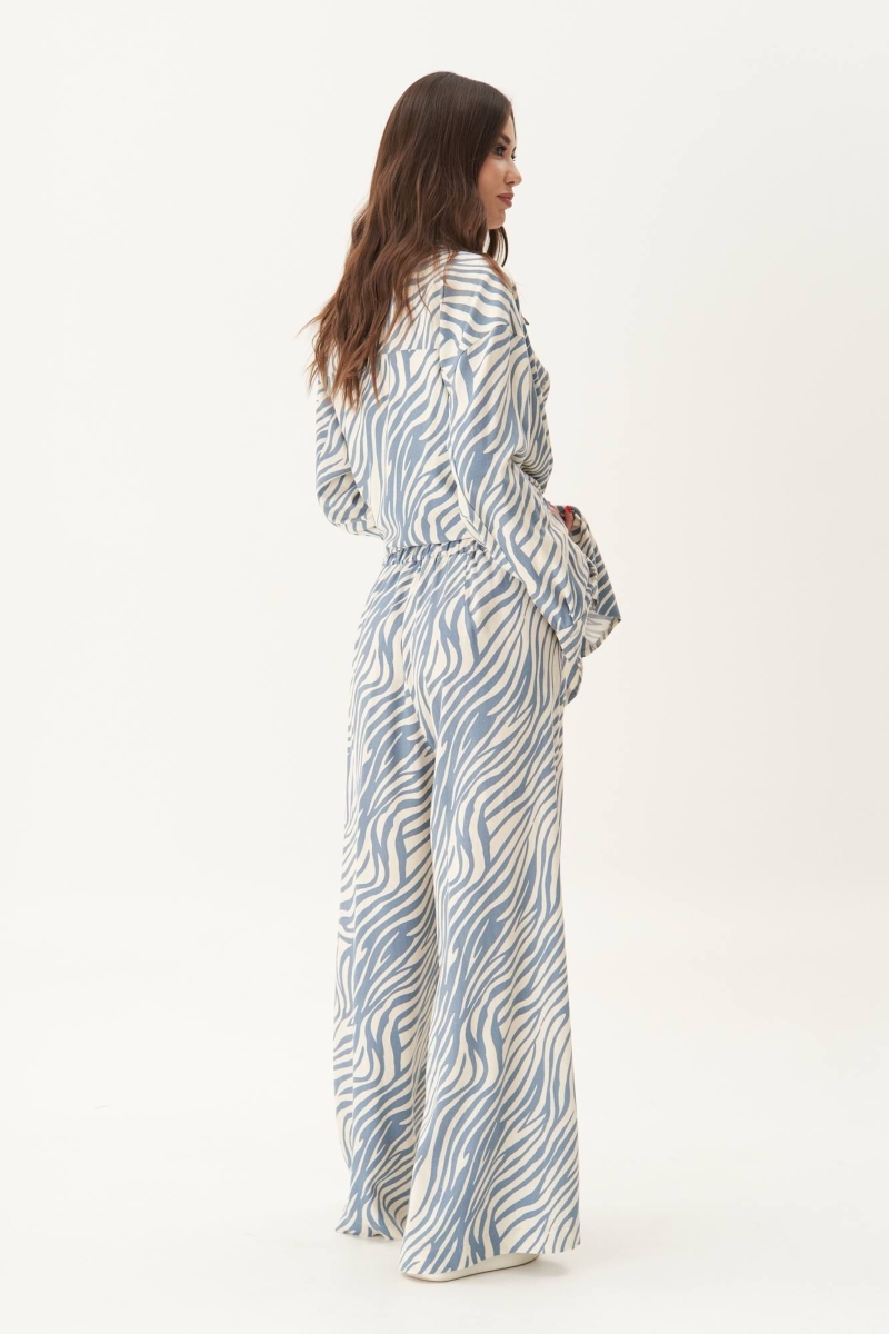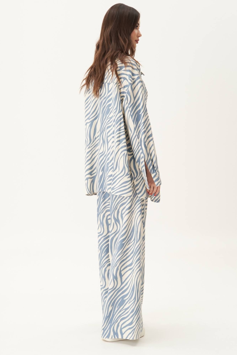 Свободная широкая рубашка и брюки-палаццо. Силуэт оверсайз, покрой рубашечный, воротник классический рубашечный с отрезной стойкой. Полоска, с отрезной кокеткой и накладным карманом. Спинка с отрезной кокеткой.