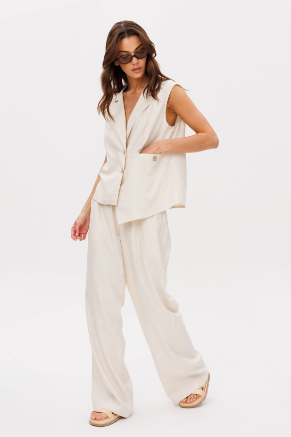 Костюм с жилетом - прекрасное решение для смелых экспериментов. Выполненный в нейтральной цветовой гамме, он позволяет дополнять себя различными аксессуарами и создавать каждый раз новые актуальные образы. Жилет прямого силуэта с центральной застёжкой и фигурным разноуровневым бортом. Спинка с декоративной разноуровневой планкой, которая имитирует застежку. Брюки прямые расслабленного стиля, на притачном эластичном поясе с наклонными боковыми карманами.