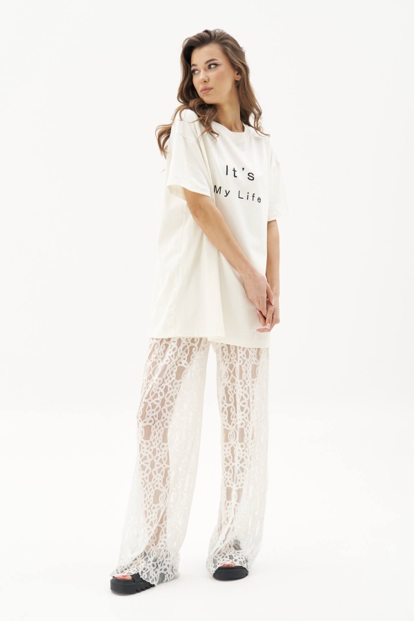 Мода лета 2024 представляет прозрачные ткани, как один из ключевых трендов сезона. Платья из таких полотен уже давно не в новинку, но в этом сезоне к ним мы добавили другую вариацию женской одежды : невероятный брючный комплект, который, развеваясь шикарными складками, создаёт у окружающих иллюзию подглядывания. Свободная футболка и гипюровые брюки с эластичными шортами внутри. Футболка широкая, удлинённая, с дизайнерским принтом и заниженной линией плеча. Брюки в свободном, расслабленном стиле, на притачном эластичном поясе и с подкладкой шортами из х/б трикотажного полотна. Длина брюк около 105см.