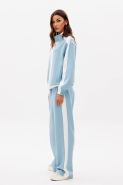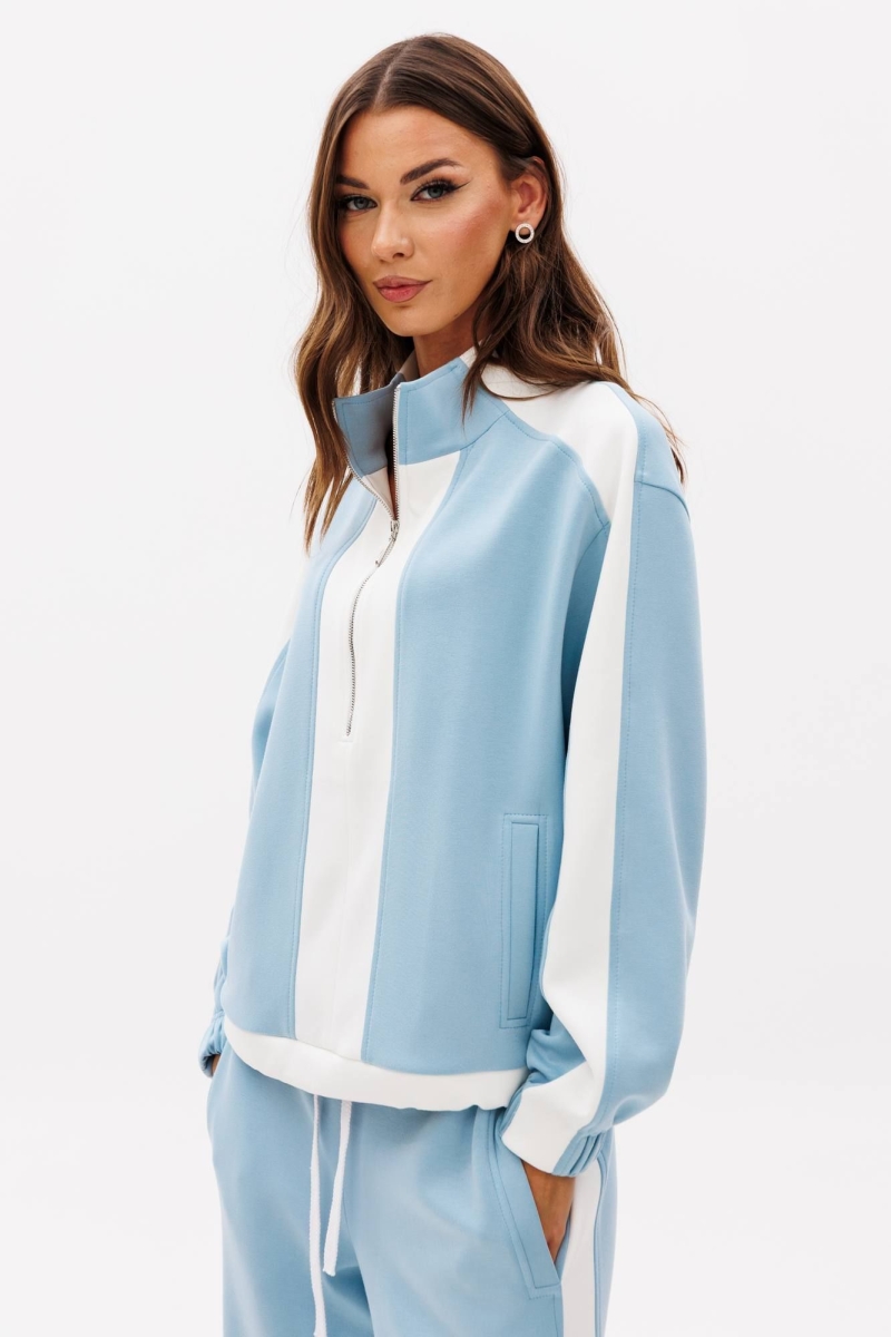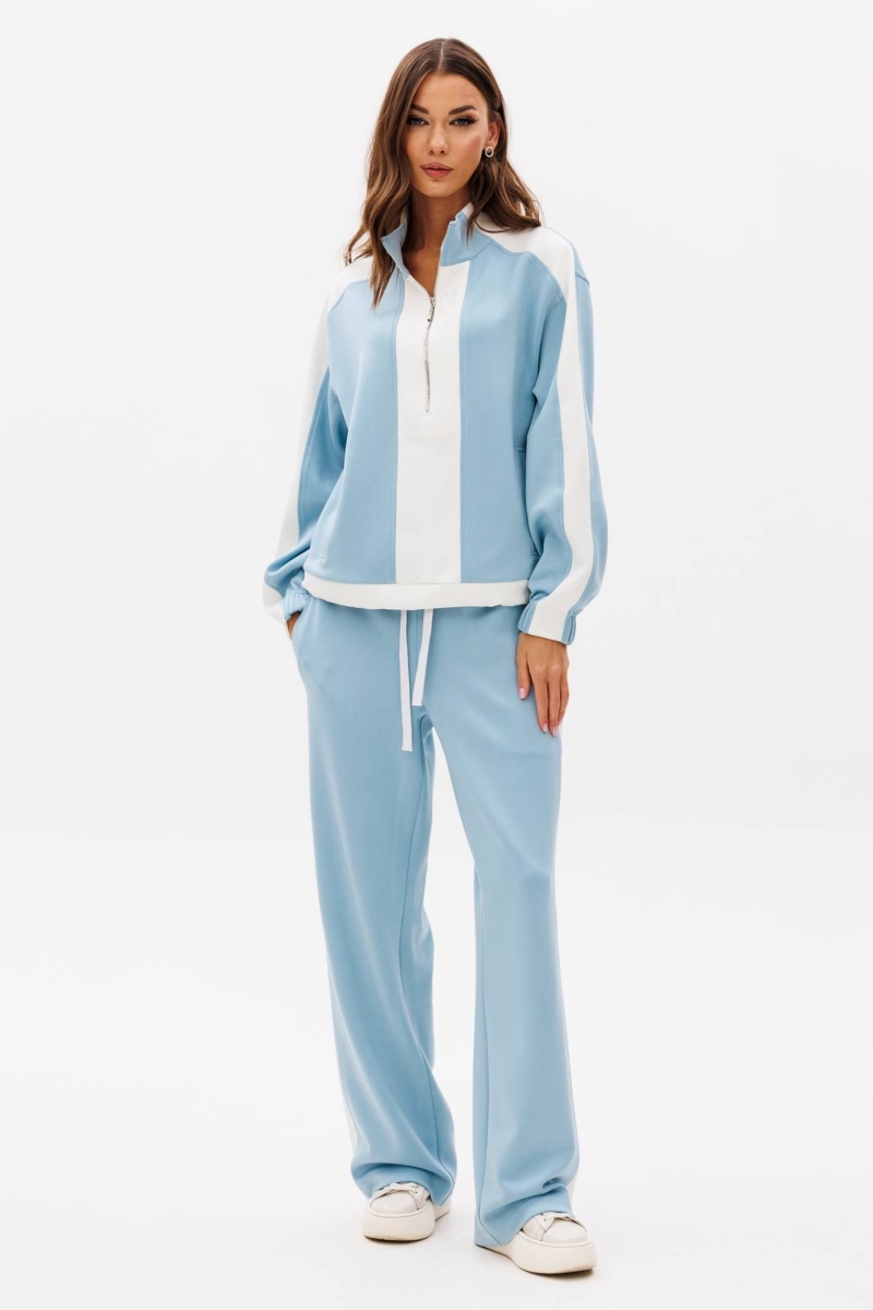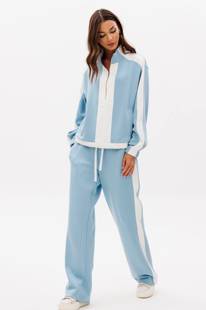 Контрастные лампасы на брюках, рукавах, по центру переда и низу придают модели особую динамичность и изысканность.