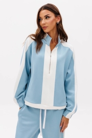 Свободный, упрямлённый свитшот с заниженной линией плеча, воротником-стойкой, частичной застёжкой на тесьму-молнию, прорезными карманами, рукавом, состоящим из 3-х частей с притачной манжетой и кулисой с регулирующей эластичной тесьмой и фиксаторами по низу изделия.