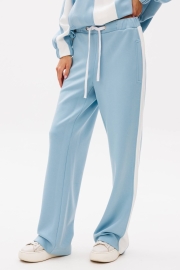 Брюки свободные, прямые на притачном эластичном поясе с контрастными лампасами и карманами с листочками в боковых швах.