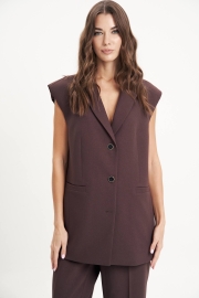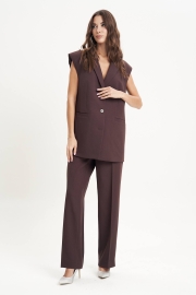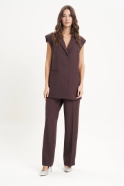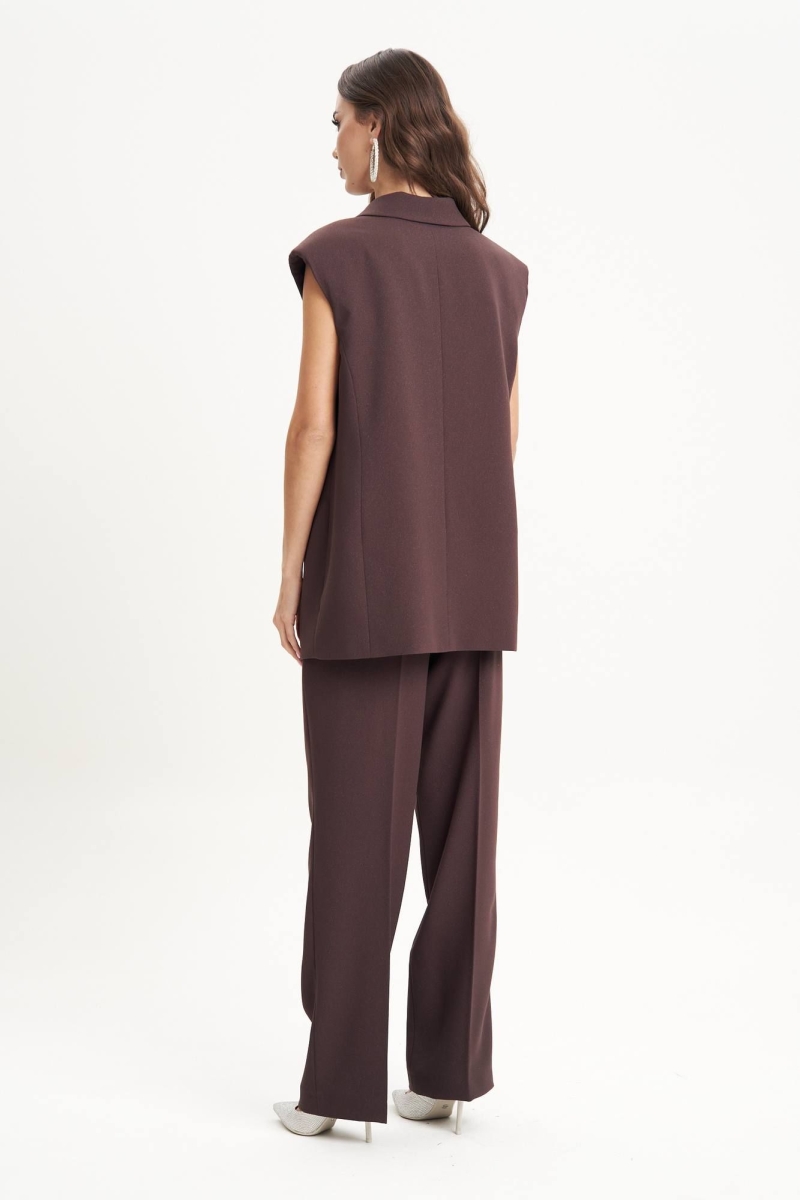 Полуприлегающий удлинённый жилет и прямые брюки отлично подчёркивают фигуру, а слегка расширенные плечи жилета придают дополнительную изюминку образу.