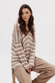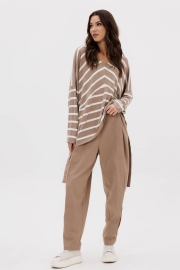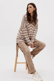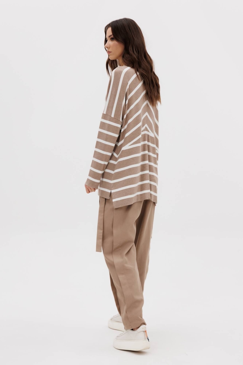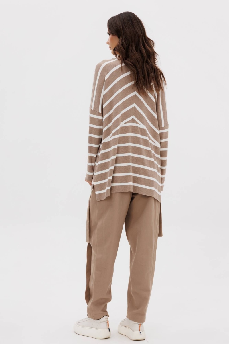 Этот брючный комплект-максимум стиля и практичности. Его легко можно ""разобрать"" на составные части и сочетать с другими вещами. Он акцентирует внимание на вашей индивидуальности и делает комфорт приоритетам! Свободный упрямленный джемпер в полоску из трикотажа и супер трендовые брюки из хлопкового габардина. Джемпер упрямленный, с заниженной линией плеча, боковыми разрезами и разноуровневым низом.