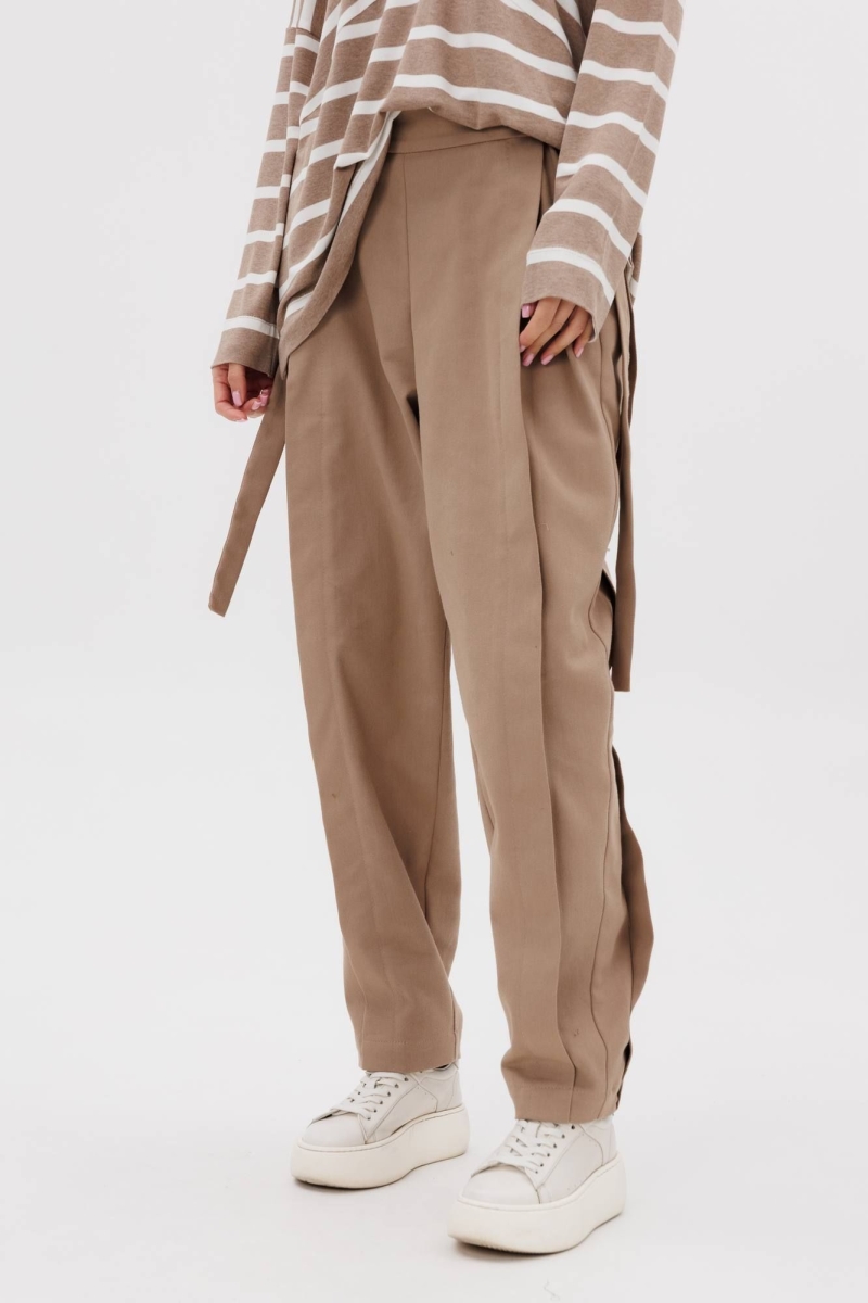 Брюки в расслабленном стиле, сложного покроя с притачным поясом по центральным передним и задним половинкам и цельнокроеных эластичным поясом по бочкам. Без застежки, с мягкими застроченными складками по переду и спинке, слегка зауженные к низу. Линия талия регулируется притачным поясом с полукольцами.