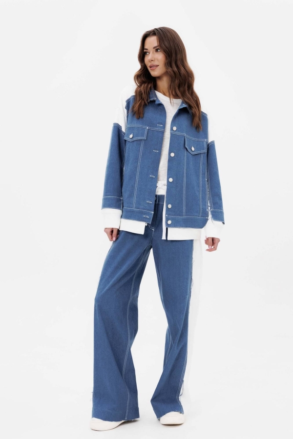 Удобство, практичность, неформальность и самодостаточность. Эти критерии, главным образом, учитывались при создании невероятного костюма в стиле спорт-кэжуал. Это по-настоящему стильное и смелое решение: соединить трикотажный футер и джинс-в итоге, идеальная одежда для прогулок, отдыха, встреч с друзьями. Удобная куртка свободного покроя с заниженной линией плеча, рубашечным рукавом, центральной застежкой и стояче-отложным воротником. Полочка с отрезной кокеткой, вертикальными рельефами, верхним карманом с клапаном и боковым карманом, притачным поясом. Спинка с отрезной кокеткой, боковыми рельефами и притачным поясом. Рукав на притачной манжете, со вставкой из джинсовой ткани. По линии плеча, боковой части и низу-вставки из контрастного трикотажного хлопкового полотна. Брюки свободного кроя, на притачном эластичном поясе с люверсами, кулисой и декоративным шнуром. Передние половинки брюк с боковыми карманами имитацией пояса. По боковым швам-лампасы из трикотажного футера. Длина куртки около 64 см Длина рукава около 76 см. Длина брюк около 106 см