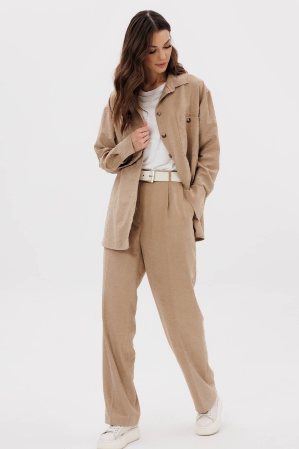 Несмотря на то, что это достаточно выдержанный ансамбль, сочетание рубашки с длинным рукавом и брюк - постоянный выбор трендсеттеров, пленяющих сердца тех, кто старается следить за направлениями в моде. Свободная классического, рубашечного покроя, с цельной застёжкой и классическим рубашечным воротником. Полочка с накладным карманом, спинка с отрезной кокеткой и мягкой бантовой складкой. Рукав рубашечный с отрезной манжетой на застёжке. Брюки классические на притачном поясе со шлёвками с наклонными боковыми карманами. По передним половинкам брюк - мягкие складки, по задним половинкам - вытачки и прорезной карман с листочкой. Длина рубашки около 74 см. Длина рукава около 75 см. Длина брюк около 105 см. Ремень в комплект не входит.