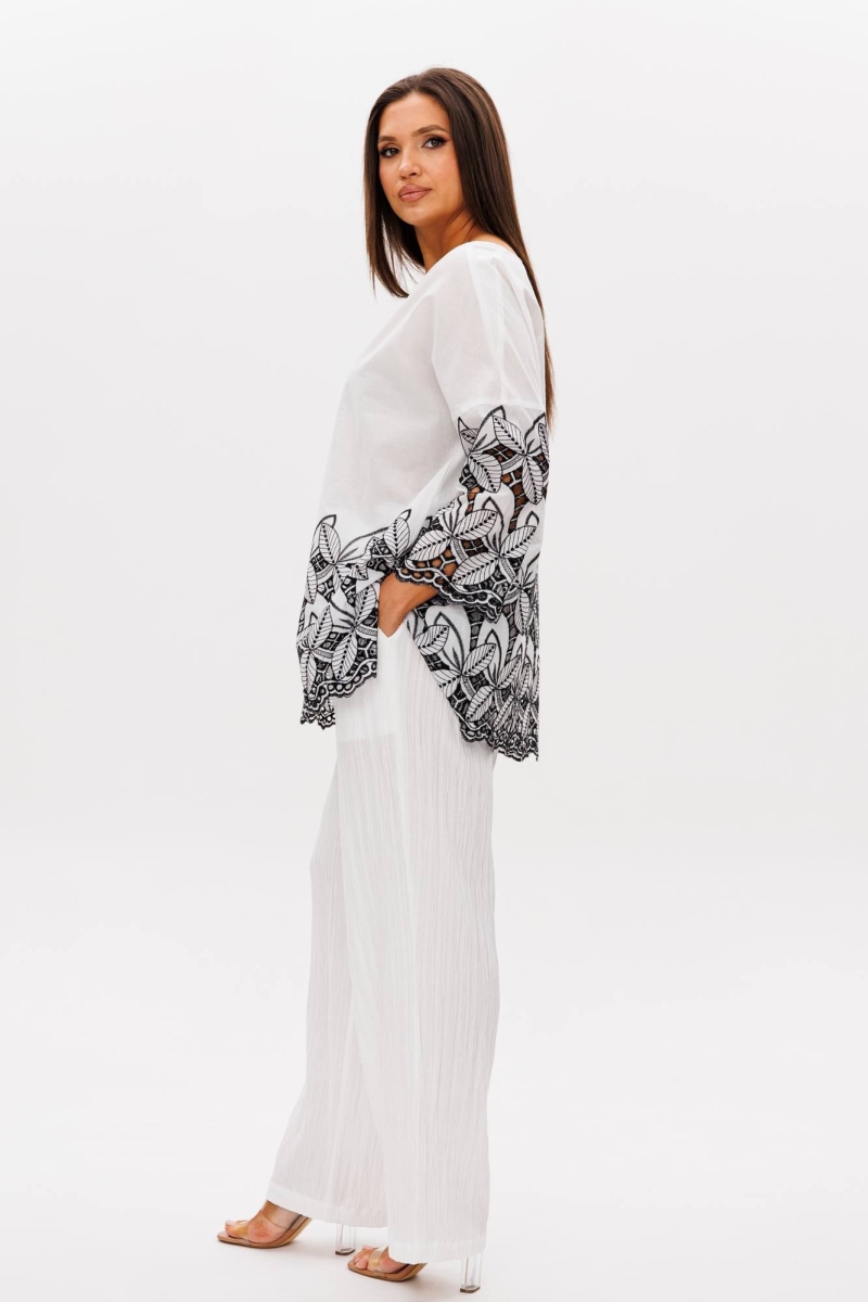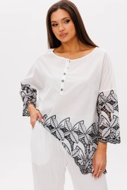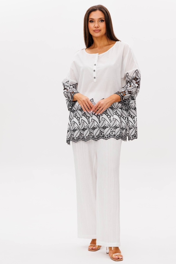 Мода лета 2025 года встречает нас особенным настроением и утонченной женственностью. вдохновленная историей романтизма, но адаптированная под современные реалии, нео-романтикс ярко выделяется на фоне прочих трендов. Особенностью этого стиля является любовь к легким материалам, подчеркивающим не только женскую мягкость, но и силу уверенной в себе леди. Свободная блуза-туника из хлопчатобумажного батиста с контрастной вышивкой. Рубашечный покрой, круглая расширенная горловина, частичная застежка в верхней части полочки, рукав длины 3/4. брюки свободные, прямые от линии бедра, на эластичном поясе, с наклонными боковыми карманами. Длина туники около 77 см. Длина рукава с плечом около 54 см. Длина брюк около 105 см.