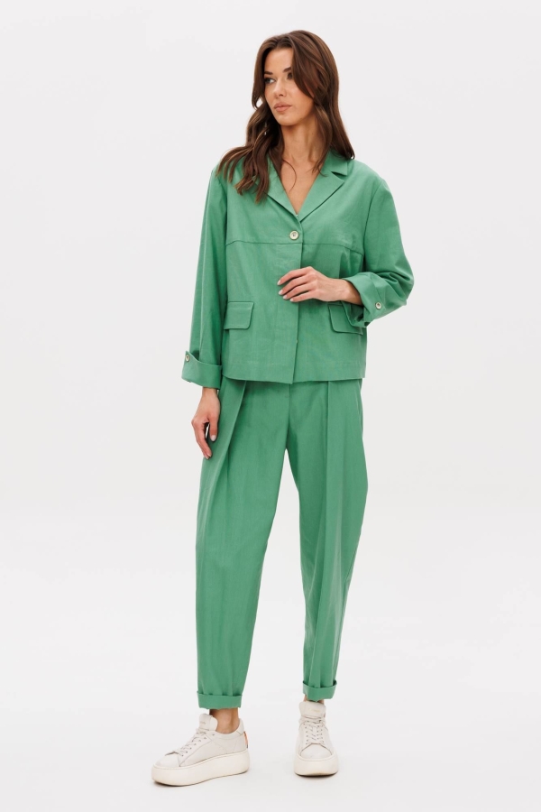 Свободный жакет упрямленного силуэта, втачного покроя с центральной застежкой и классическим пиджачным воротником. Полочка с прорезным карманом с клапаном, очередной кокеткой и потайной застежкой.