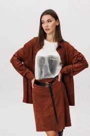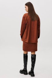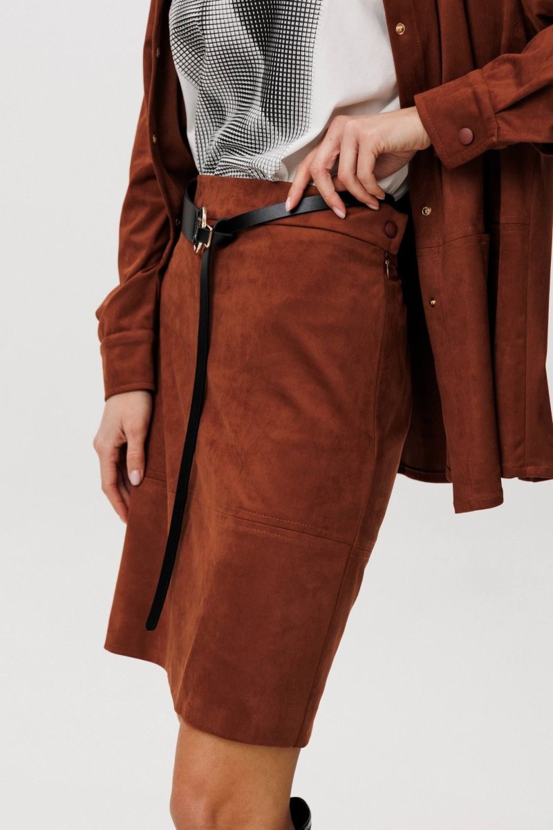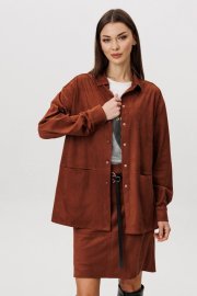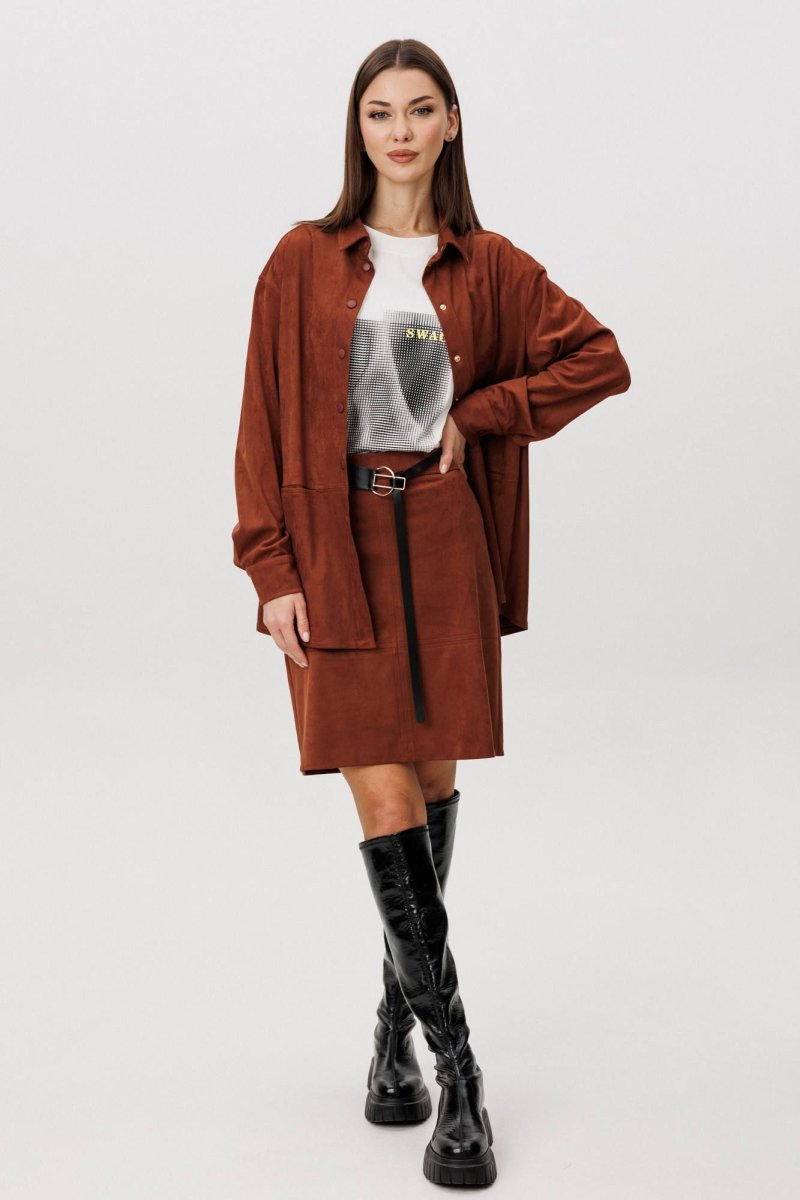 Замша уже несколько сезонов подряд удерживает статус одного из главных трендов. Для тех кто следит за модными новостями, это неудивительно: эта благородная фактура стала основой большинства модных дизайнерских коллекций. Эффектная, она органично вписывается в самые разные образы. Образ, который говорит сам за себя, смелый и дерзкий, и в то же время очень комфортный. Рубашка из замши-нестандартная, но стильная альтернатива куртке, но на более теплую погоду. Свободный, расслабленный силуэт, рубашечный покрой, центральная застежка на кнопки. Полочка с горизонтальным членением ниже линии талии и карманом в шве. Спинка с отрезной кокеткой и мягкими складками. Рукав с локтевым швом, разрезом в нем, мягкой складкой и притачной манжетой по низу. Низ изделия-фигурный. Воротник-классический рубашечный. Юбка из замши-это изюминка осеннего гардероба, позволяющая создавать любые образы, воплощая ваши самые смелые идеи. Юбка на притачном поясе, эластичном в области спинки, силуэт слегка А-образный. Переднее полотнище со швом по центру и горизонтальным членением, заднее полотнище с талиевыми вытачками, центральным швом и горизонтальным членением. Застежка в боковом шве на потайную молнию. Юбка на эластичной подкладке. Длина рубашки около 75 см. Длина рукава с плечом около 74 см. Длина юбки около 48 см. Пояс в комплект не входит