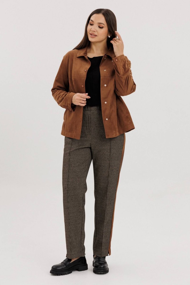 Стильный женский брючный костюм в стиле смарт-кэжуал сочетает комфорт и элегантность. Рубашка выполнена из замшевой ткани, брюки из трикотажа с декоративными замшевыми вставками. Идеальный выбор для офиса, деловых встреч и повседневных образов.
