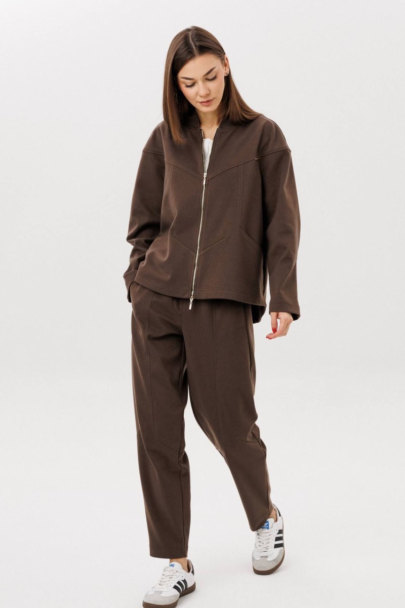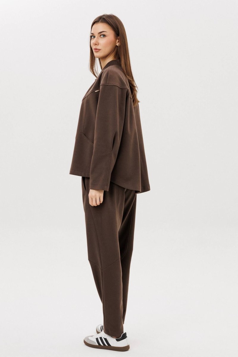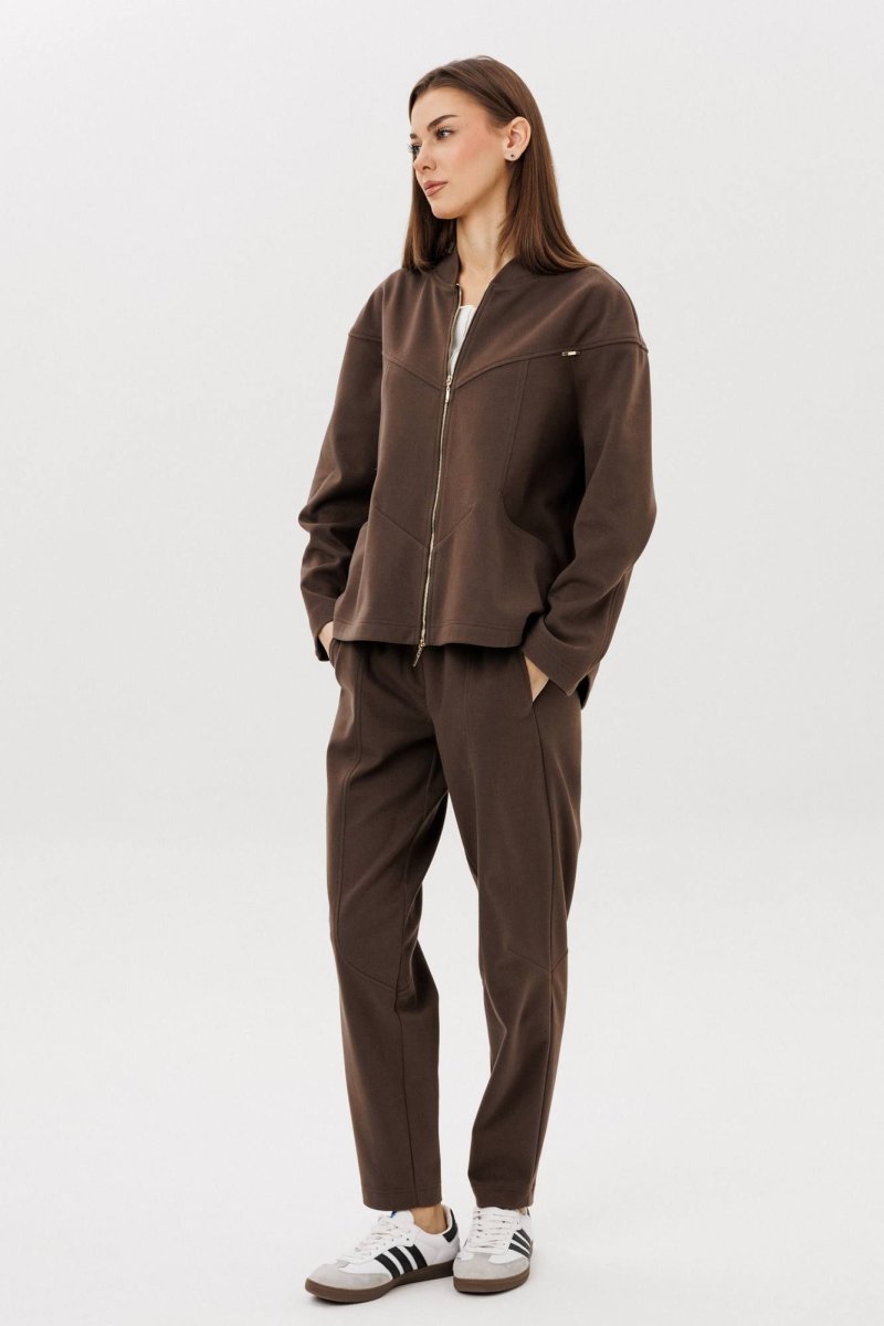 Свободный силуэт, комбинированный покрой, центральная застежка на тесьму-молнию, капюшон рукав-частичный реглан с отрезной широкой манжетой и мягкой складкой в области локтя. Полочка с отрезной кокеткой и фигурным рельефом, переходящим в карман. Спинка с отрезной кокеткой. Брюки свободные, на эластичном поясе в области спинки, с фигурными вертикальными рельефами по центру передних и задних половинок, вытачками в области колена и боковым наклонным карманом. В комплекте топ прилегающего силуэта без рукава.