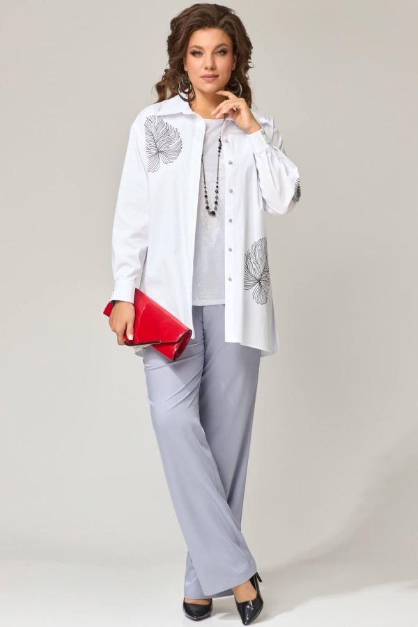 Комплект женский ""Радаси"" тройка. Блуза из хлопокой ткани, прямого силуэта. Рукав втачной, длина рукава не регулируется, манжет на застежку, на петли пуговицы. Воротник рубашечного типа со стойкой, край борта обработан отрезной планкой. Топ прямого силуэта с выточкой по груди. Горловина и пройма обработаны планкой, низ в подгибку. Брюки прямого силуэта с застежкой на молнию и пуговицу. По переду брюк карманы, верх брюки обработан поясом, по спинке резинка. Низ обработан в подгибку. Внимание! Украшение в комплект не входит.