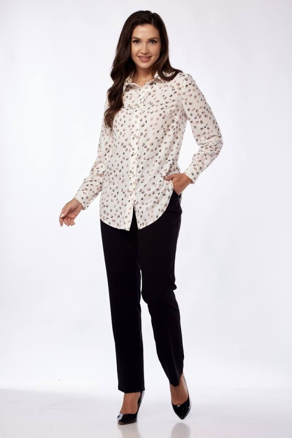 Блузка женская, прямого силуэта. Мультидизайн. Горловина круглая с отложным воротником на стойке. Застежка сквозная на петли и пуговицы. Рукав втачной, длинный с манжетом на застежку. Низ рукава оформлен манжетой на петли и пуговицы. Низ изделия фигурный. Брюки прямого силуэта. Пояс на застежке на молнию и на пуговицу. Карманы боковые прорезные.