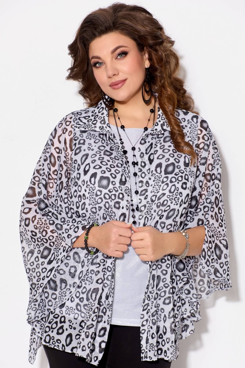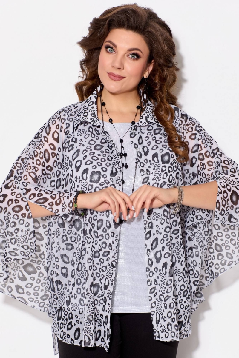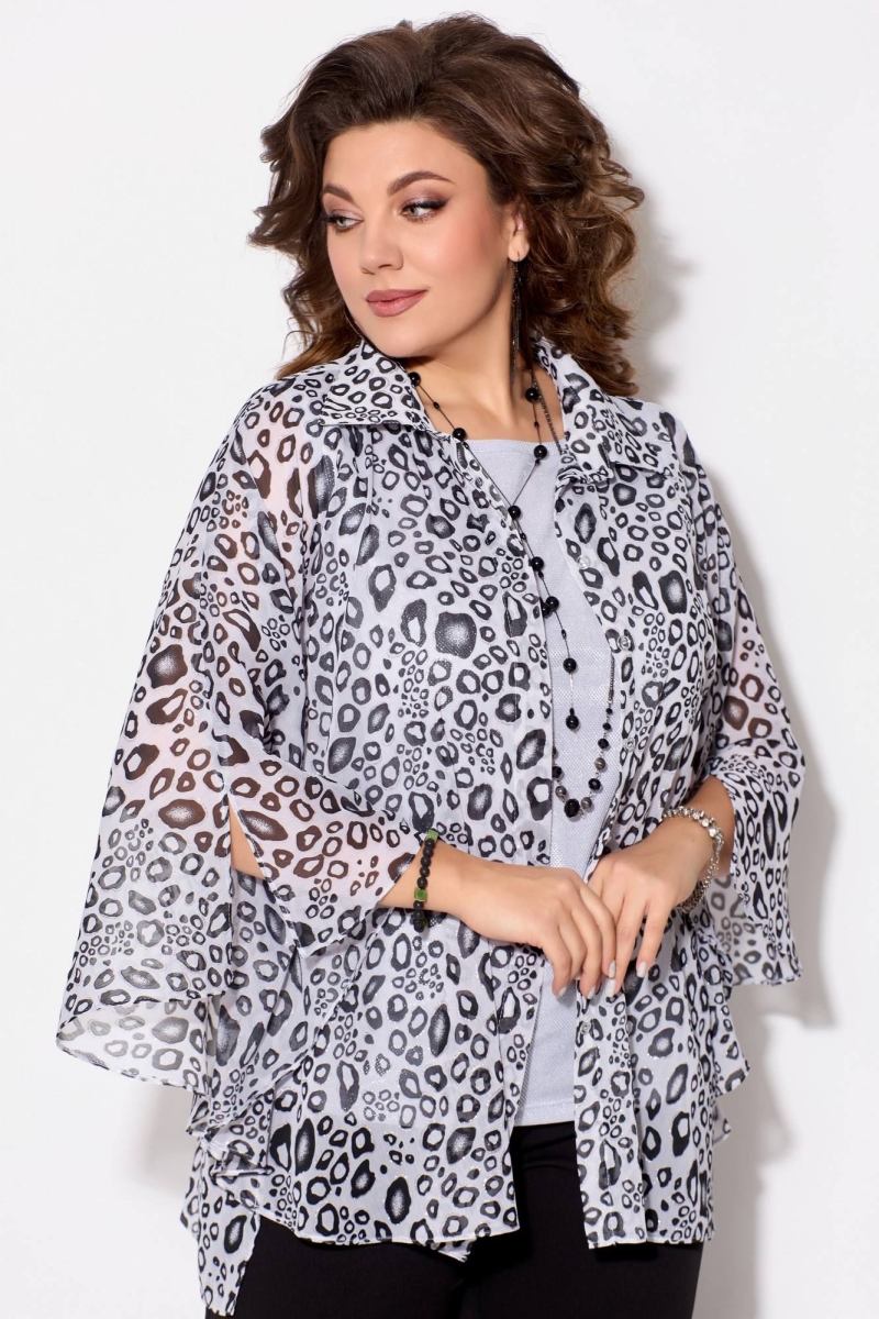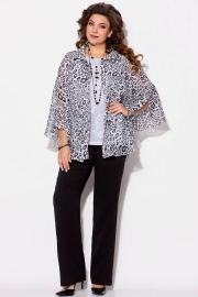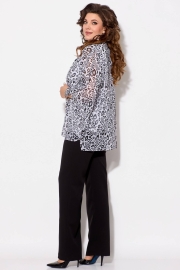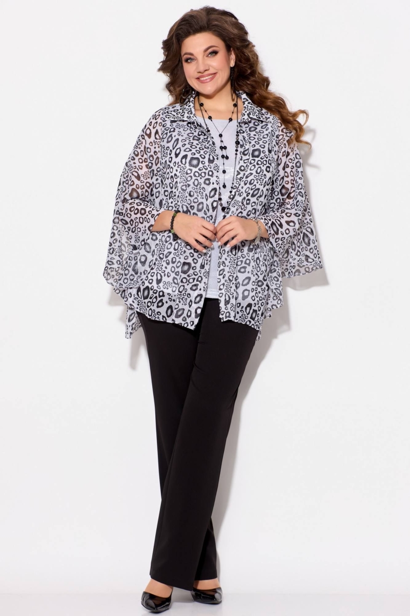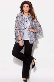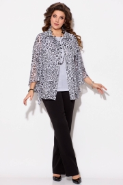 Комплект женский брючный "Ветрана" тройка. Блузка расширенная к низу. Полочка на потайную застежку на петли и пуговицы. Воротник рубашечного типа на стойке. Низ обработан швом в подгибку. Топ прямого силуэта с выточкой по груди. Горловина и пройма обработаны планкой, низ в подгибку. Брюки прямого силуэта с застежкой на молнию и пуговицу. По переду брюк карманы, верх брюк обработан поясом, по спинке резинка. Низ обработан в подгибку.
