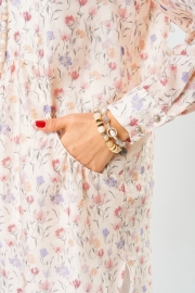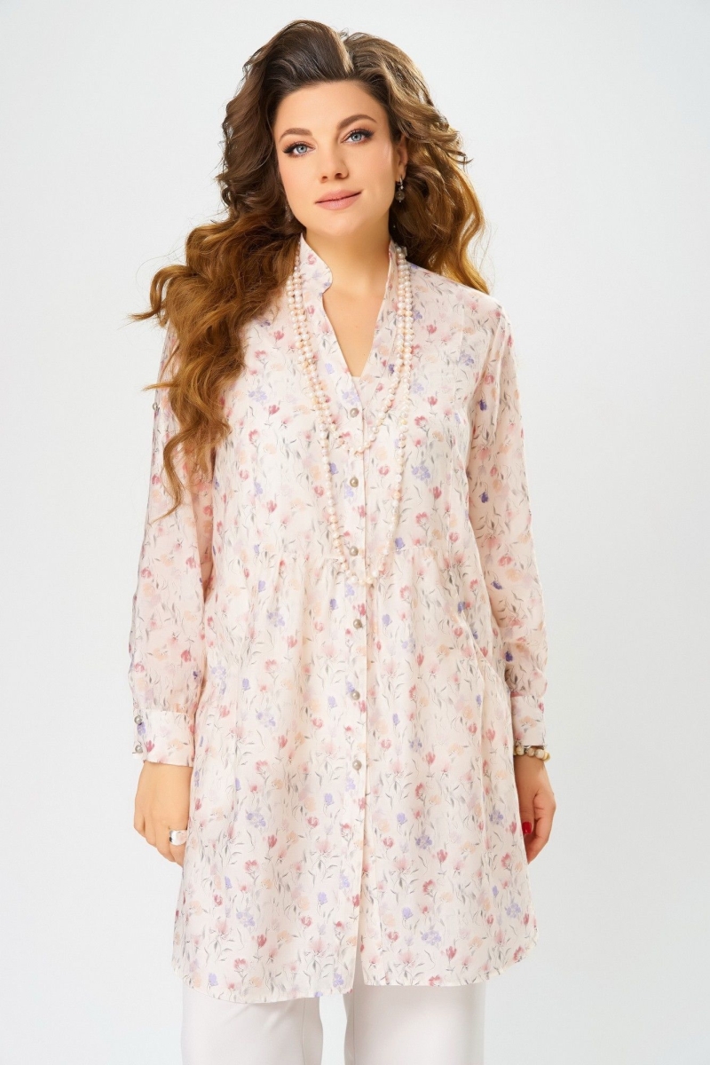 Туника, выполненная из воздушной ткани «Вуаль», покоряет изящным цветочным принтом и легкостью. Ее прямой силуэт обеспечивает свободу движений, а слегка прозрачная структура добавляет загадочности. Длинные рукава с притачной манжетой и застежкой на пуговицы позволяют регулировать длину, а фигурный вырез горловины с отрезными планками и воротник-стойка придают образу особый шарм. Фигурные карманы со сборкой на передней части добавляют стильные акценты, а изящные складки в области талии формируют женственный силуэт. Завершают образ фигурный низ с боковыми разрезами, придающий легкость движений.