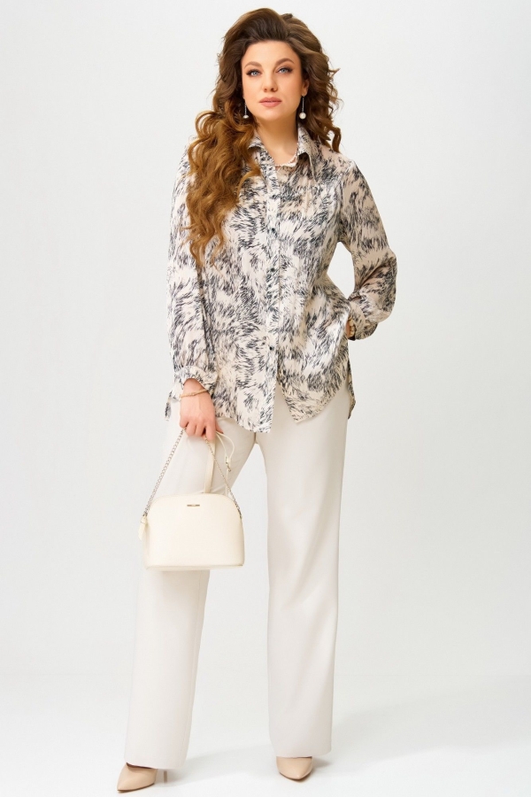 Нарядный стильный брючный комплект "Хариса" состоит из блузки и брюк, выполнен из текстильной ткани. Женская блузка "Хариса" выполнена из текстильной ткани. Блузка прямого силуэта. Воротник отложной рубашечного типа на стойке, застежка на петли и пуговицы, планка отрезная. По спинке блузки кокетка, рукав в блузке втачной, по низку рукава манжет с застежкой на петлю и пуговицы. По полочке сборка и отрезная кокетка. Низ изделия обработан швом в подгибку с открытым срезом. В боковых швах блузки - разрезы. Женские брюки выполнены из качественной текстильной ткани. Брюки прямого силуэта с застежкой на молнию и пуговицу. По переду брюк карманы, верх брюк обработан поясом, по спинке резинка. Низ обработан в подгибку. Стильный комплект украсит Ваш образ, можно носить по отдельности с другими комплектами одежды!