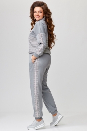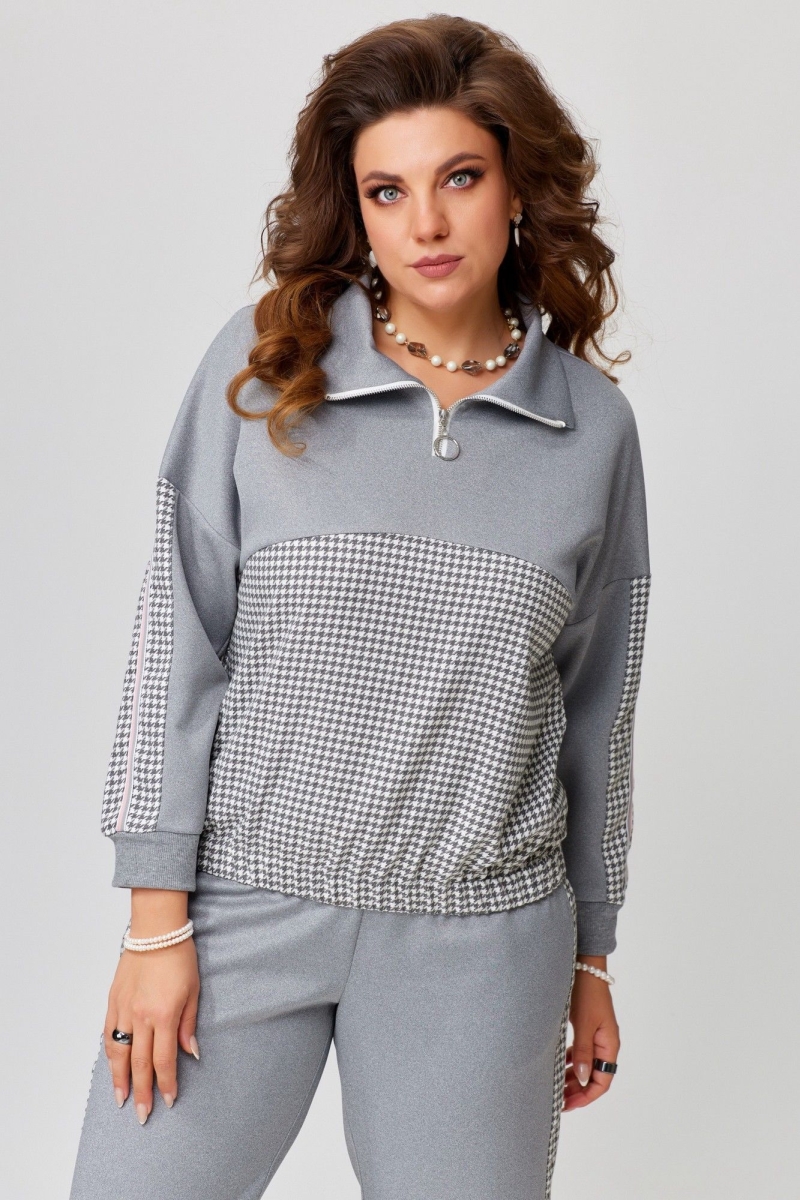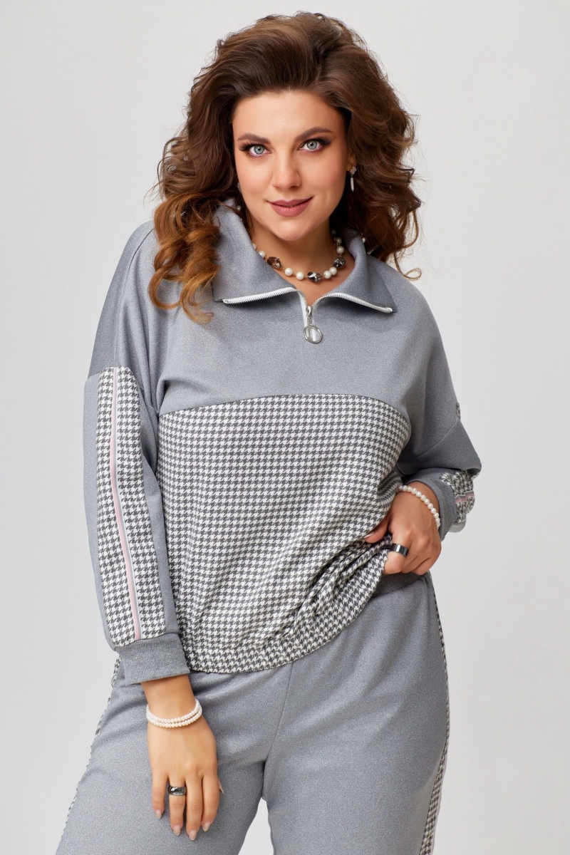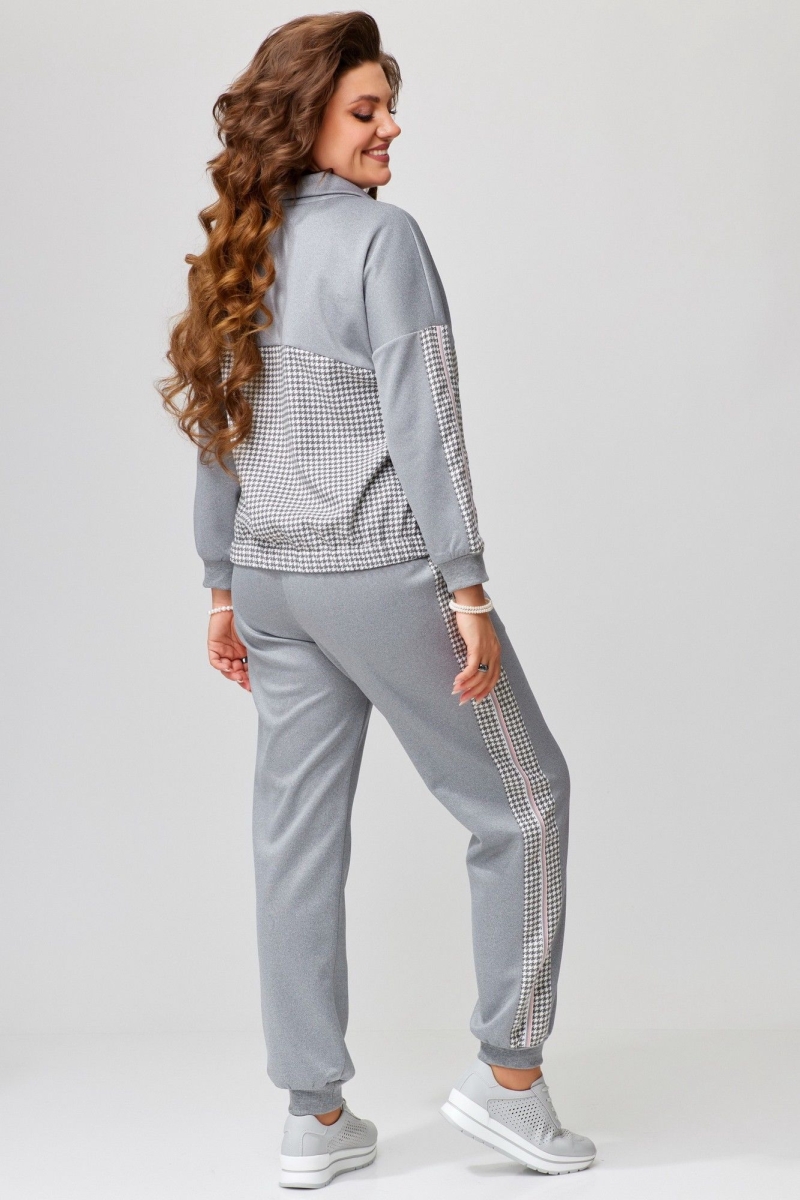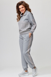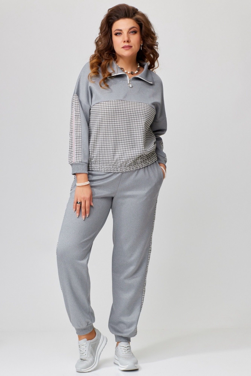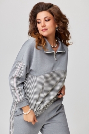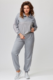 Женский спортивный комплект "Васса" состоит из джемпера и спортивных брюк. Джемпер без подкладки, свободного покроя со спущенным рукавом. Воротник-стойка с застежкой на молнии, по спинке и полочке кокетка из трикотажной ткани, подрезы по спинке и полочке из текстильной ткани с рисунком гусиной лапки. По рукаву вставка из текстильной ткани с настроченной декоративной тесьмой. По низу джемпера резинка, по низу рукава - манжет. Спортивные брюки выполнены из трикотажного плотна с текстильной ставкой с рисунком гусиной лапки. В боковом шве выполнен карман, пояс на резинке, по низу брюк манжеты.