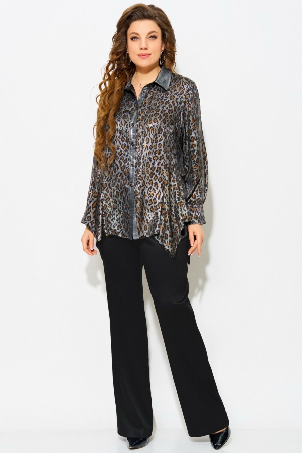 Блузка "Русалия" без подкладки, ткань мягкая, приятная к телу, присутствует леопардовый сатиновый рисунок. Это стильная блузка полуприлегающего силуэта, эффектом блузки является отделка из сатиновой серебристой ткани. Застежка в блузке однобортная: одна планка из отделочной сатиновой серебристой ткани, вторая планка из основной леопардовой ткани, в шов вставлен кант из отделочной ткани. Воротник рубашечного типа со стойкой, по краю воротника кант. По полочке блузки рельефы, по бокам подрезы, расклешенные к низу. По спинке блузки - отрезная кокетка и рельефы. Рукав втачной с лампасом из отделочной ткани. По низу рукава - манжет с застежкой на две пуговицы. Низ изделия обработан швом в подгибку с закрытым срезом.