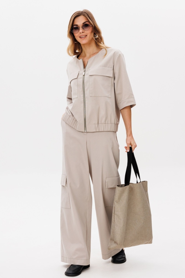 Костюм состоит из жакета и брюк выполненных из джинсовой ткани. Жакет с застежкой на молниии крупными настрочными карманами с клапанами по переду. Рукав втачной одношовный. Низ жакета собран на планку с резинкой. Брюки расширенные книзу с притачным поясом на резинке.По поясу саположены шлевки. Передние части с застежкой на молнию с гульфиком и петлю с пуговицей на поясе. В верхней части в боковых швах карманы с наклонным входом. В задних частях брюк талиевые вытачки. По боковой части в зоне колена накладные карманы с клапанами. Карманы, низ рукава жакета, низ брюк, пояс и шлевки обработаны отделочной шлевкой. Длина жакета - 58 см, длина рукава жакета - 35 см, длина брюк - 105 см.
