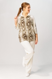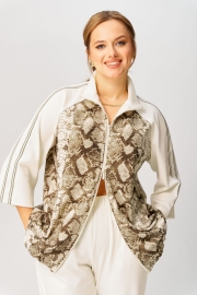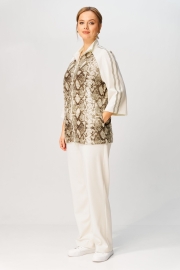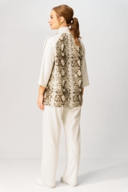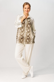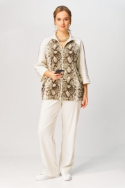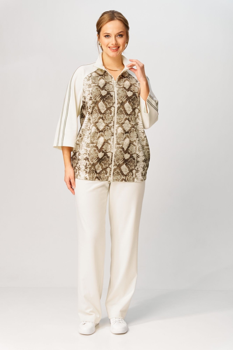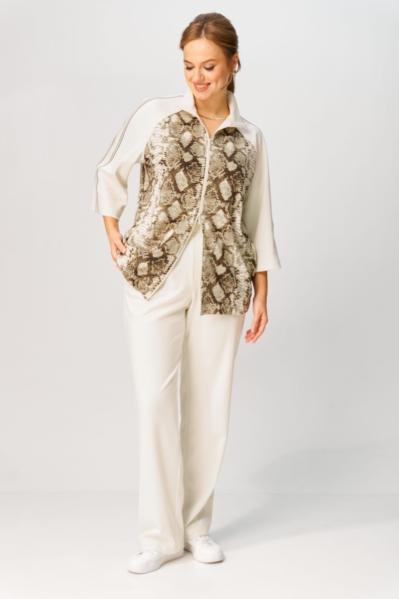 Костюм состоит из джемпера и брюк. Джемпер свободного силуэта выполнен из трикотажной ткани двух видов. Перед с застежкой на двусторонней разъемной молнии. Рукав реглан с декоративной тесьмой. Воротник стойка. Низ джемпера на резинке. В боковых швах карманы. Брюки прямые из трикотажной ткани сверху на резинке. В боковых швах карманы. Длина джемпера - 70 см, длина рукава - 56 см, длина брюк -106 см.