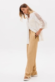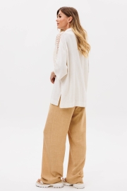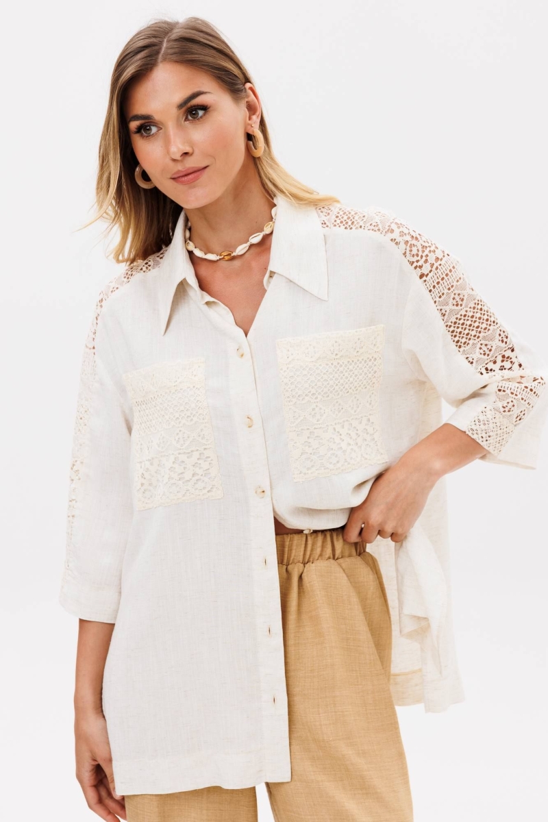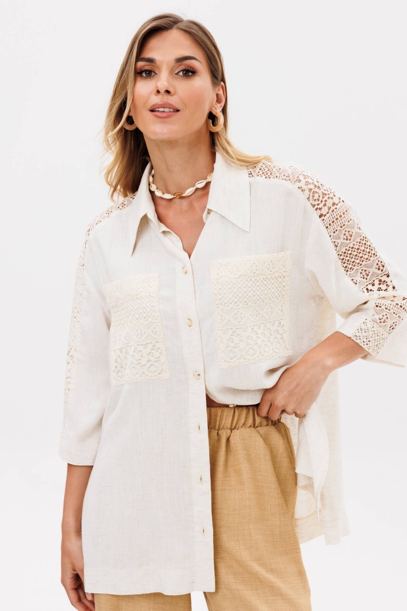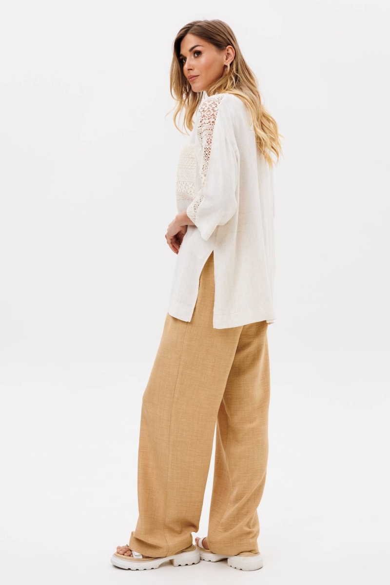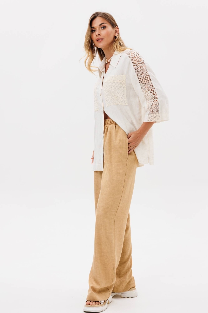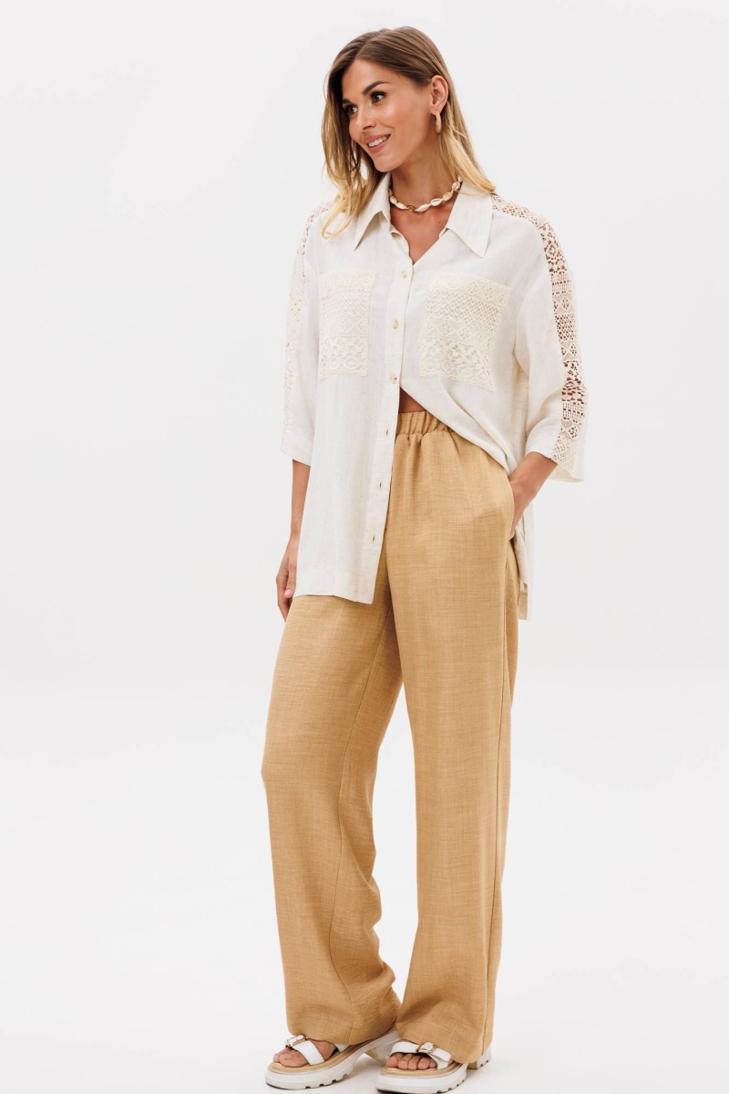 Костюм сотоит из рубашки и брюк. Рубашка свободного силуэта из легкой вискозной ткани под лен. Застежка центральная на петли и пуговицы, воротник на стойке. В боковых швах разрезы. Рукав втачной рубашечного кроя. Карманы спереди и вставка вдоль плеча и рукава выполнеы из кружева. Брюки прямые с поясом на резинке. Спереди имитация застежки гульфик. В боковых швах карманы. Длина брюк - 109 см, длина рубашки- 71 см, длина рукава рубашки - 35 см.
