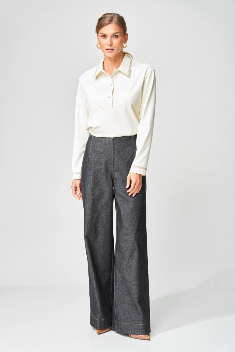 Джемпер прямого силуэта с воротником поло из плотной хлопковой ткани "двухнитка". Рукав втачной одношовный. По низу изделия, по низу рукава и по воротнику проложена отделочная строчка. Брюки расширеные книзу на притачном поясе из джинсовой хлопковой ткани. По поясу настрочены шлевки. По передним и задним частям брюк вытачки. На задних частях брюк настрочены карманы. Карманы, вытачки, пояс, низ брюк отделаны отделочной строчкой. Длина джемпера- 66 см, длина рукава - 60 см. Длина брюк с учетом пояса - 109 см