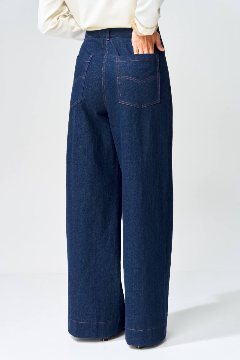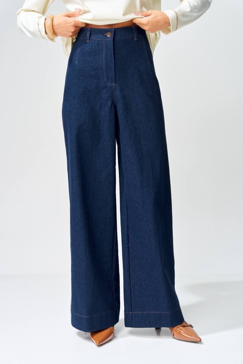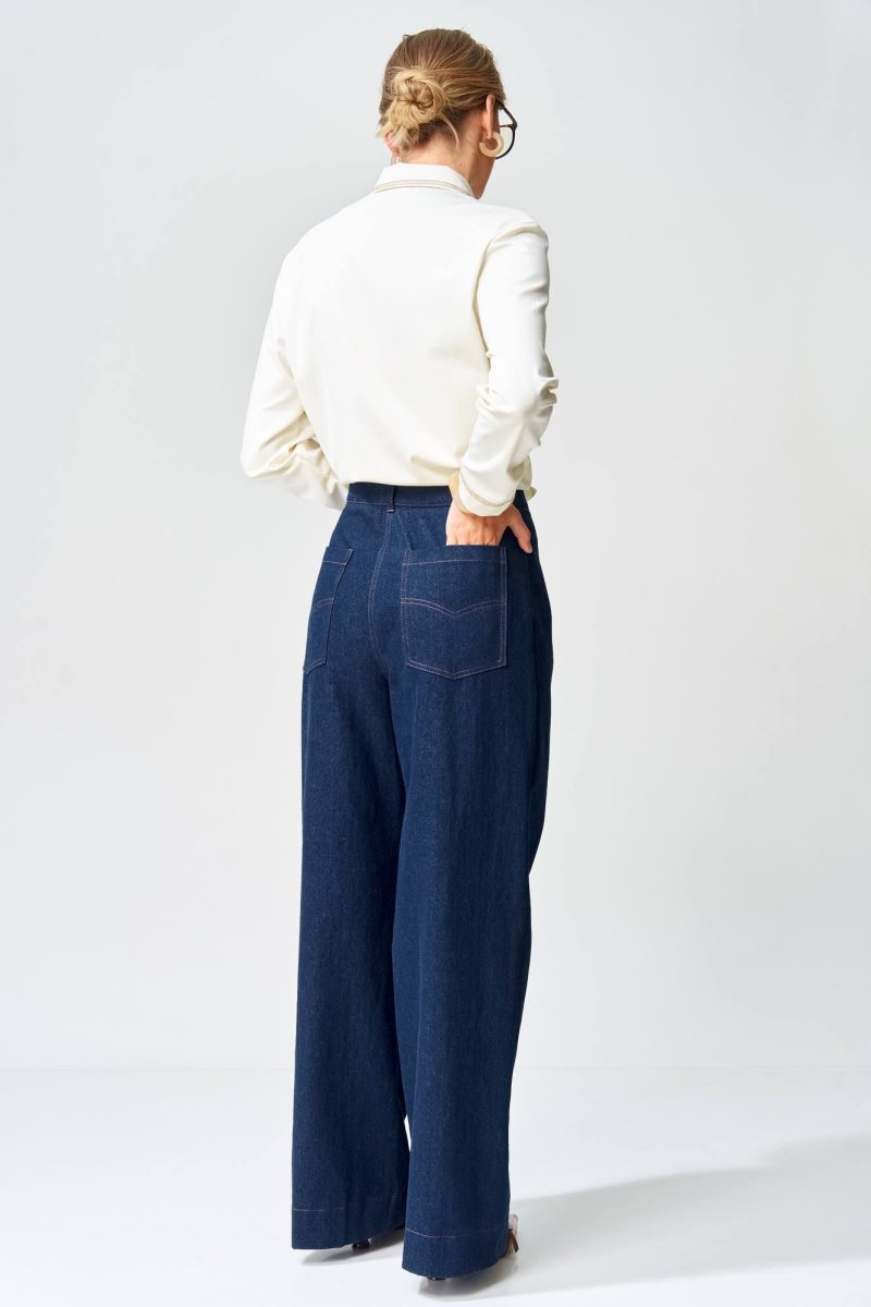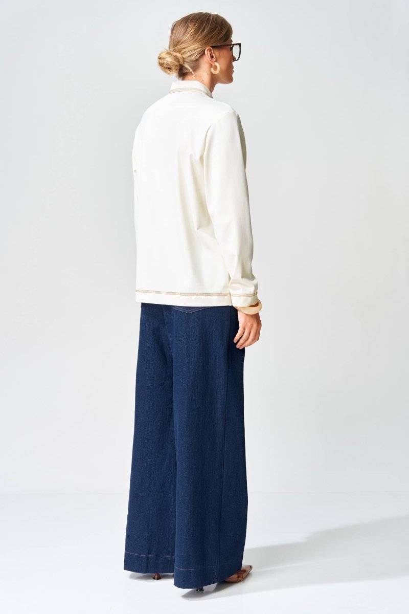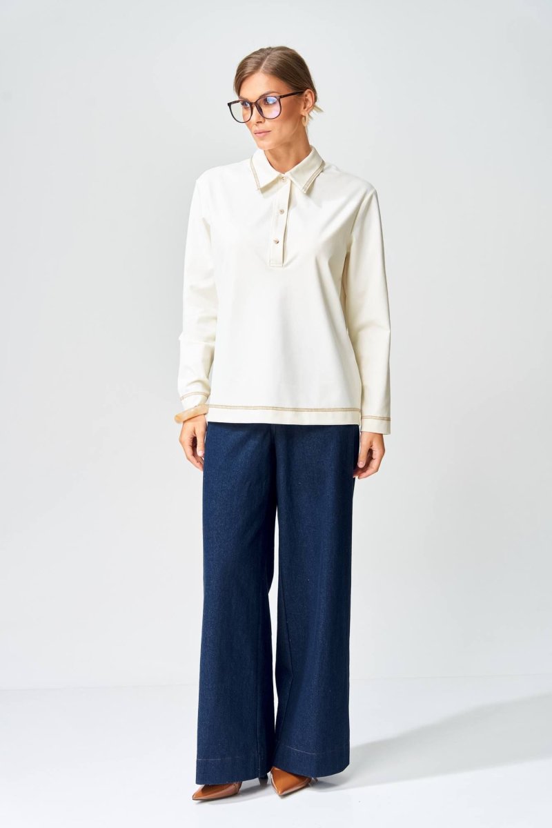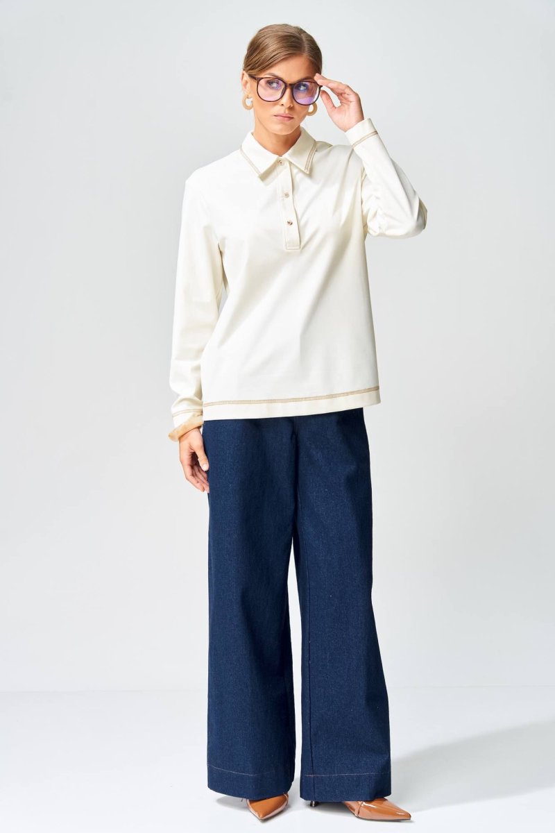Джемпер прямого силуэта с воротником поло из плотной хлопковой ткани "двухнитка". Рукав втачной одношовный. По низу изделия, по низу рукава и по воротнику проложена отделочная строчка. Брюки расширеные книзу на притачном поясе из джинсовой хлопковой ткани. По поясу настрочены шлевки. По передним и задним частям брюк вытачки. На задних частях брюк настрочены карманы. Карманы, вытачки, пояс, низ брюк отделаны отделочной строчкой. Длина джемпера- 66 см, длина рукава - 60 см. Длина брюк с учетом пояса - 109 см