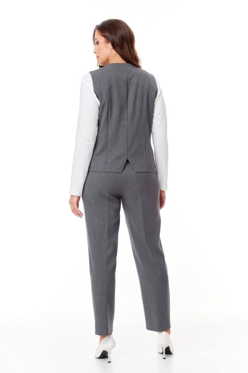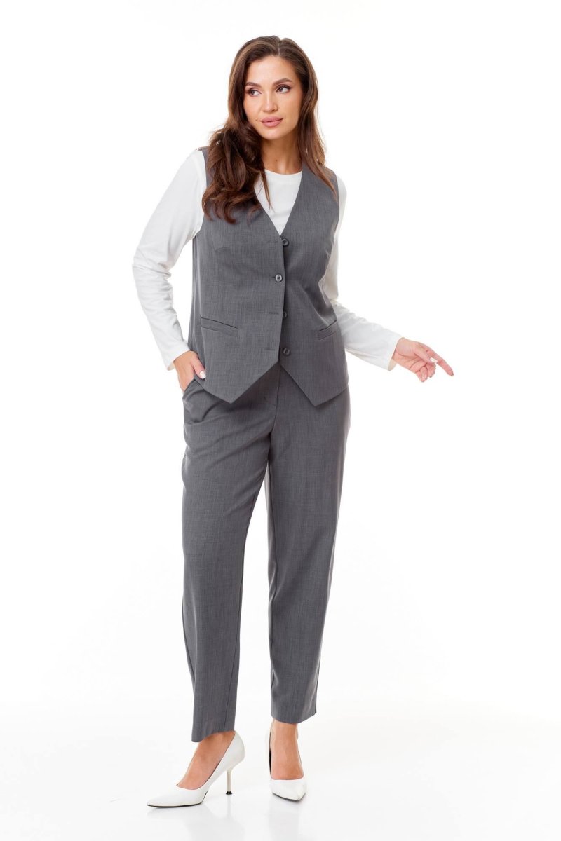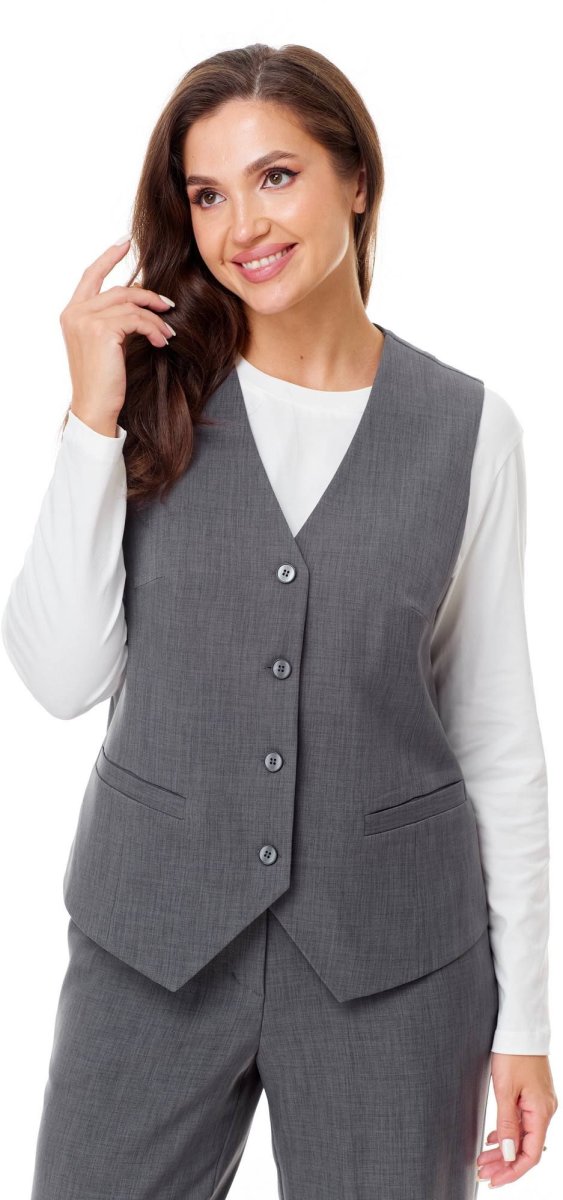 Комплект: жилет, брюки, лонгслив. Жилет классический, силуэт полуприлегающий, частично на подкладке. Застёжка центральная на 5 пуговиц. По переду декоративные карманы с листочкой. Брюки классические, чуть зауженные к низу. Пояс частично на резинке. Застёжка гульфик на пуговицу и молнию. Карманы в боковых швах. Лонслив выполнен из трикотажа. Силуэт полуприлегающий, рукав втачной. Горловина овальная. Спинка без особенностей.