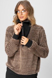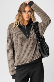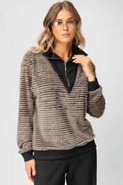 Джемпер длиной до линии бедер. Вырез горловины джемпера по переду «V-образной» формы, с втачным воротником с застежкой на декоративную тесьму-молнию. Спинка цельная. Рукава втачные одношовные, с притачными манжетами. Линия плача спущена. По низу джемпера идет притачная планка контрастного цвета.