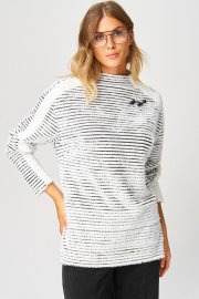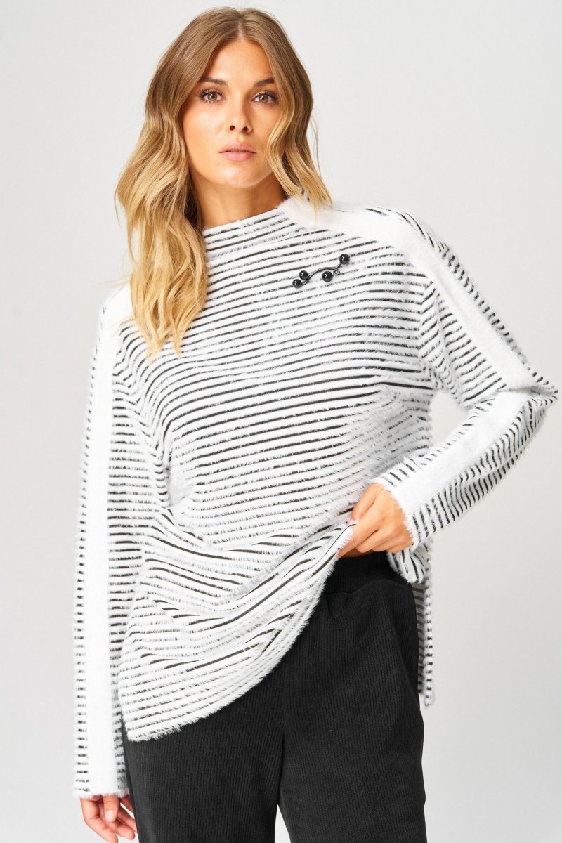 Джемпер длиной ниже линии бедер. Вырез горловины «под горло», с цельнокроеной стойкой. Спинка цельная, в боковых швах обработаны разрезы. Рукава втачные одношовные, по плечевым швам со стороны детали переда и по центру рукавов настрочена декоративная тесьма. Линия плача спущена.