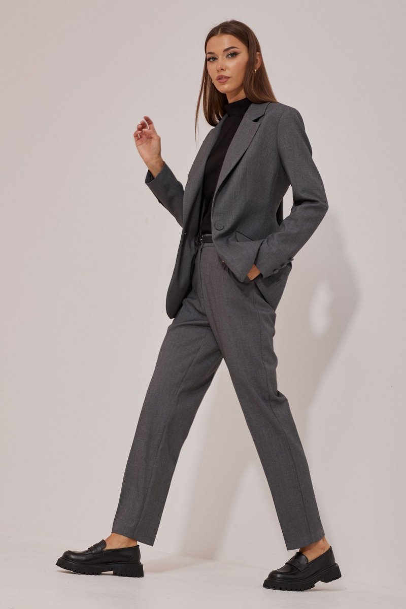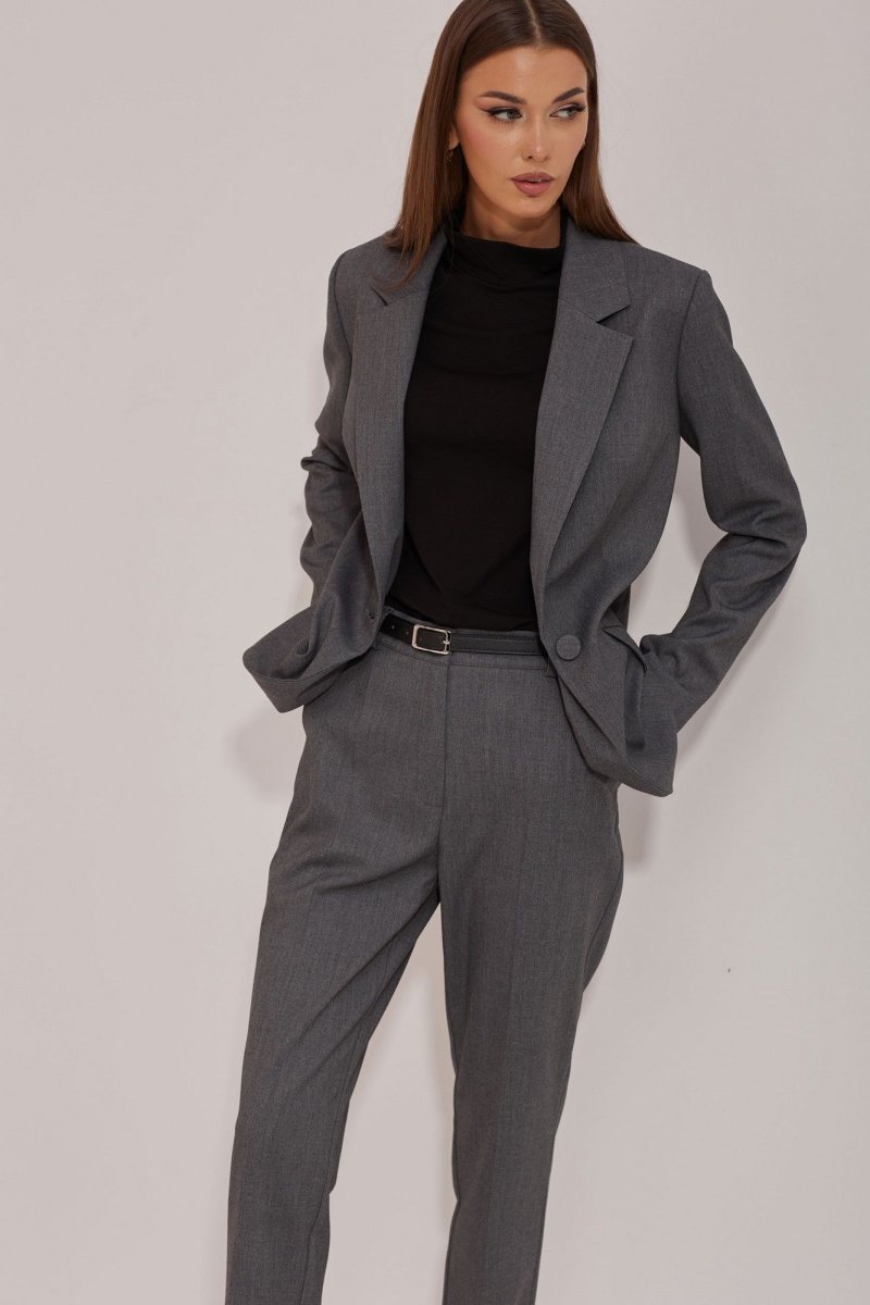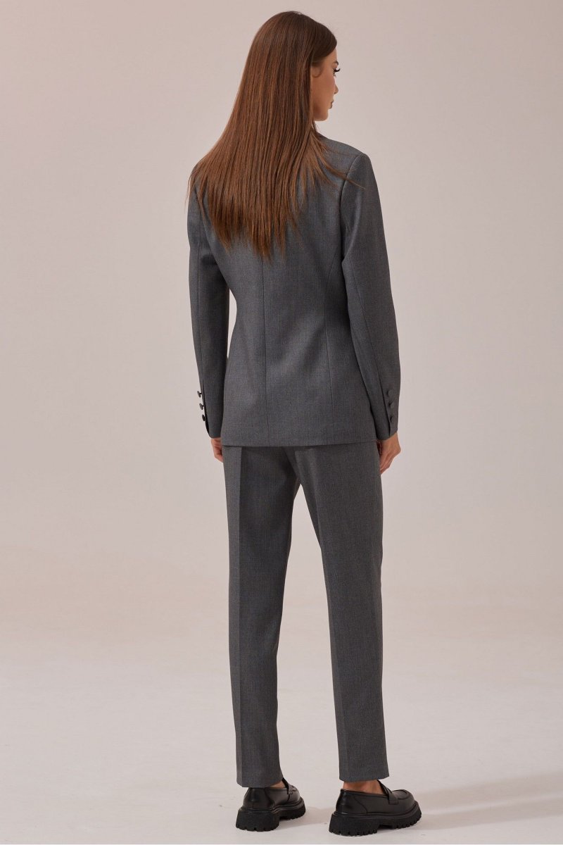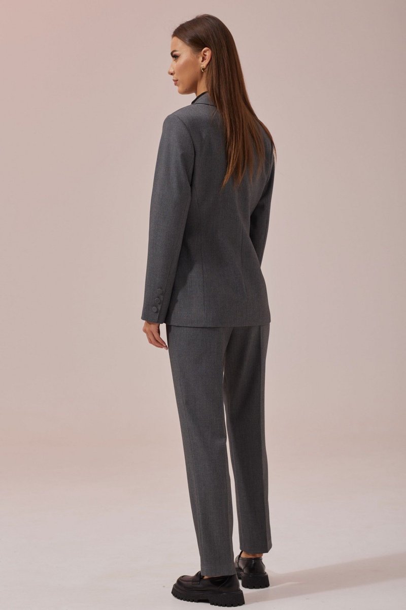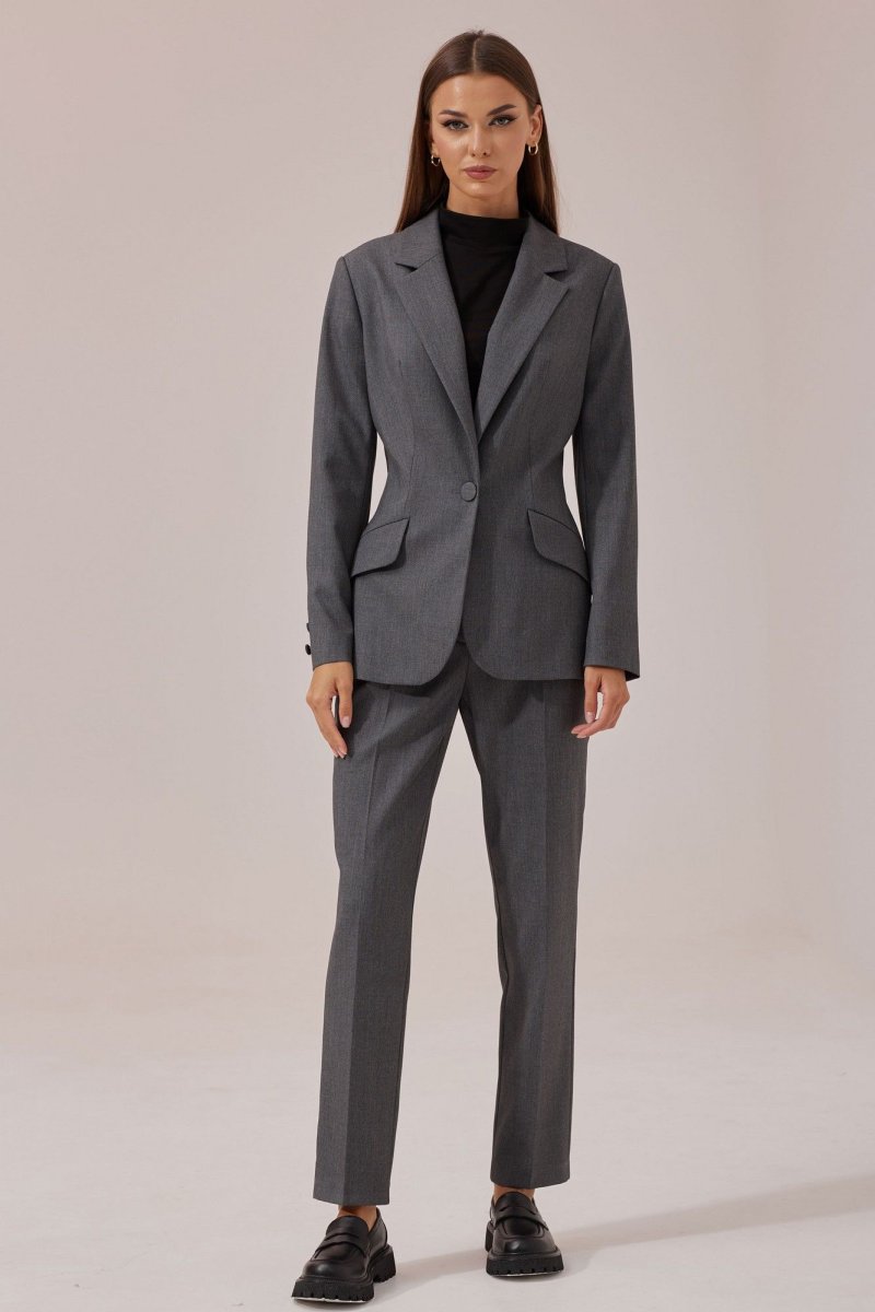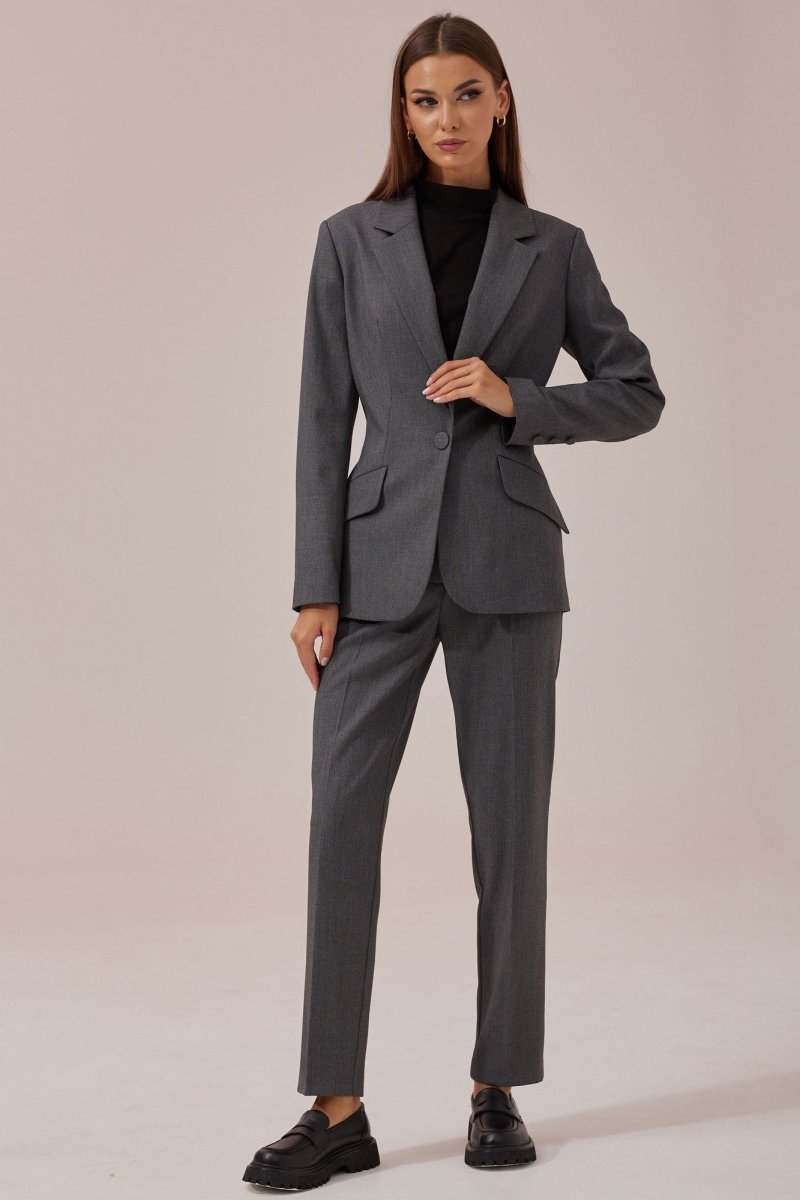 Жакет полуприлегающего силуэта из костюмной ткани. Воротник пиджачного типа с центральной застежкой на петлю и пуговицу. Рукав втачной двухшовный с декоративной шлицей и пуговицами. По переду рельефы и нагрудные вытачки, по спинке - рельефы. По переду карманы с клапанами и листочками.