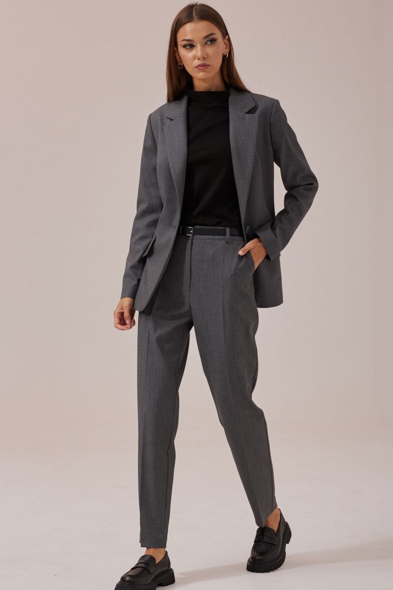 Брюки прямого силуэта зауженные книзу из костюмной ткани. По верху брюк притачной пояс с застежкой на петлю и пуговицу и шлевками для ремня. На передних половинках обработаны карманы и застежка молния в среднем шве. На задних половинках вытачки и декоративные листочки. Ремень в комплект не входит.