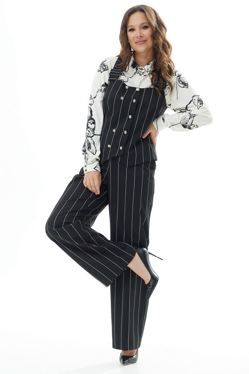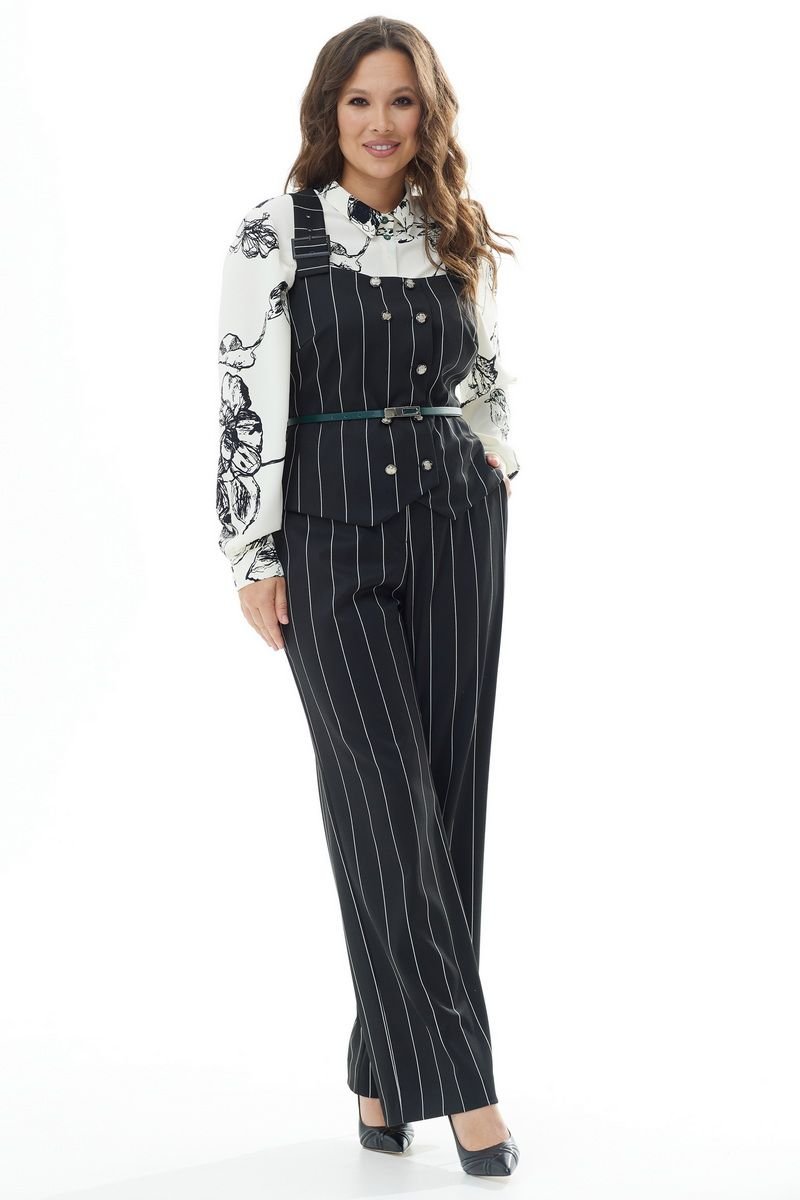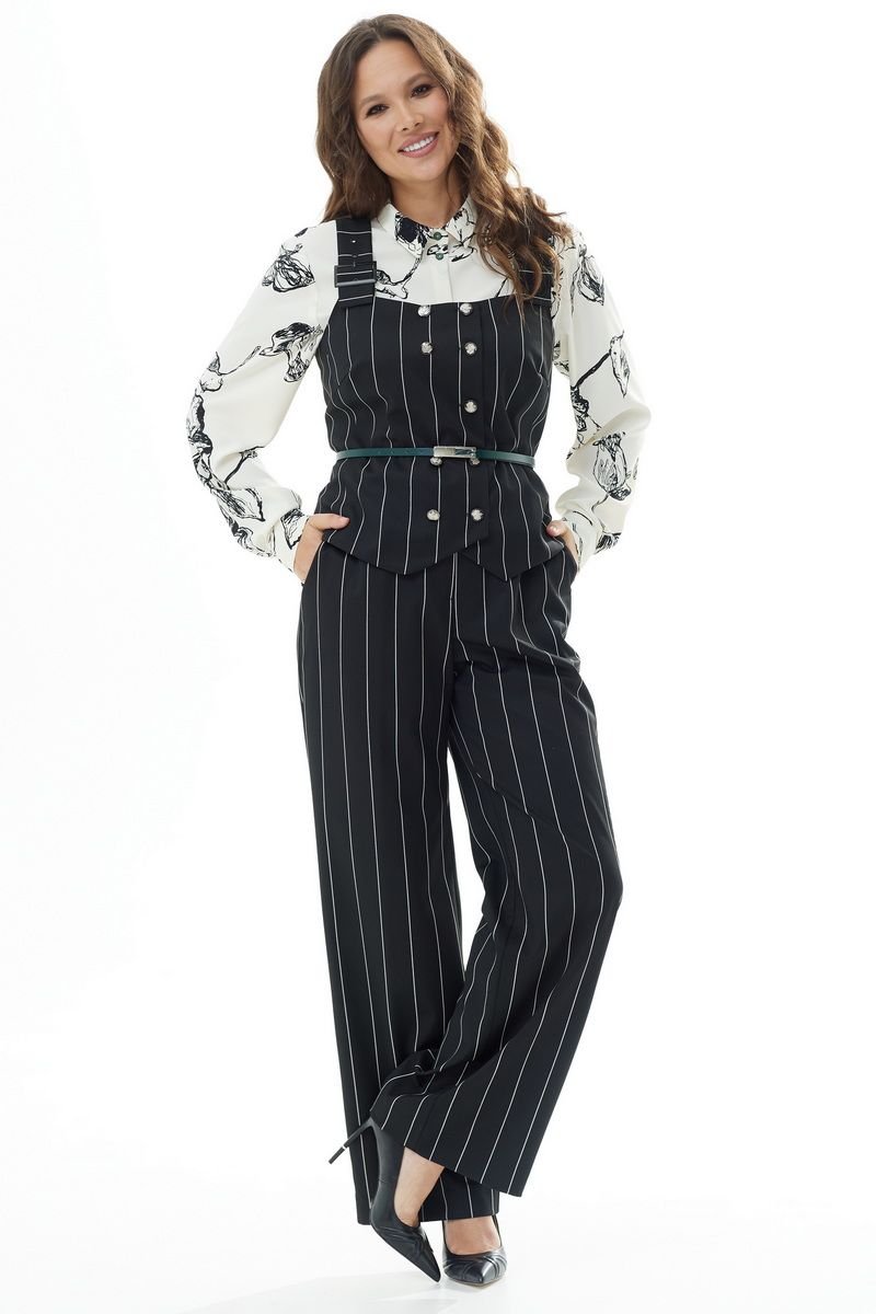 Элегантный комплект из блузы, жилета и брюк. Блуза рубашечного кроя, выполнена из креп-шифона. Рукав слегка спущен, дополнен манжетой с пришивной пуговицей. Центральная застежка на пришивные пуговицы. Жилет на подкладке, приталенного силуэт, с центральной застежкой на пришивные пуговицы. Бретели с регуляцией. Брюки прямого кроя с притачным поясом, дополненным эластичной тесьмой. Застежка на пуговицу и потайную молнию. Длина блузы от плечевого шва 67 см. Длина рукава 60 см. Длина жилета 60 см. Длина брюк 108 см