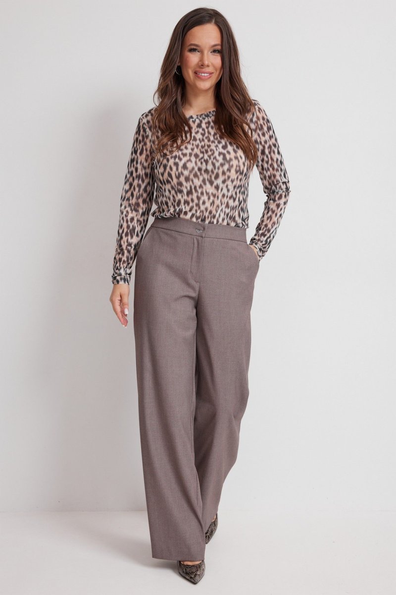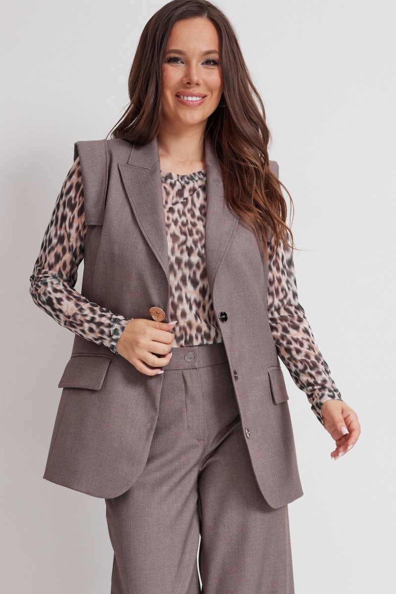 Стильный комплект из удлиненного жилета, лонгслива и брюк. Жилет полуприлегающего силуэта, на подкладке, с центральной застежкой на пришивную пуговицу и потайные кнопки. Лонгслив прямого кроя с втачным рукавом. Выполнен из текстильной сетки с принтом в стиле animal. Брюки классического прямого кроя. Посадка средняя. Пояс притачной, дополнен эластичной тесьмой. Брюки дополнены удобными боковыми карманами. Застежка гульфик на молнию и металлическую пуговицу. Длина жилета от плечевого шва 78см. Длина лонгслива от плечевого шва 62см. Длина рукава 60см. Длина брюк по боковому шву 104см.