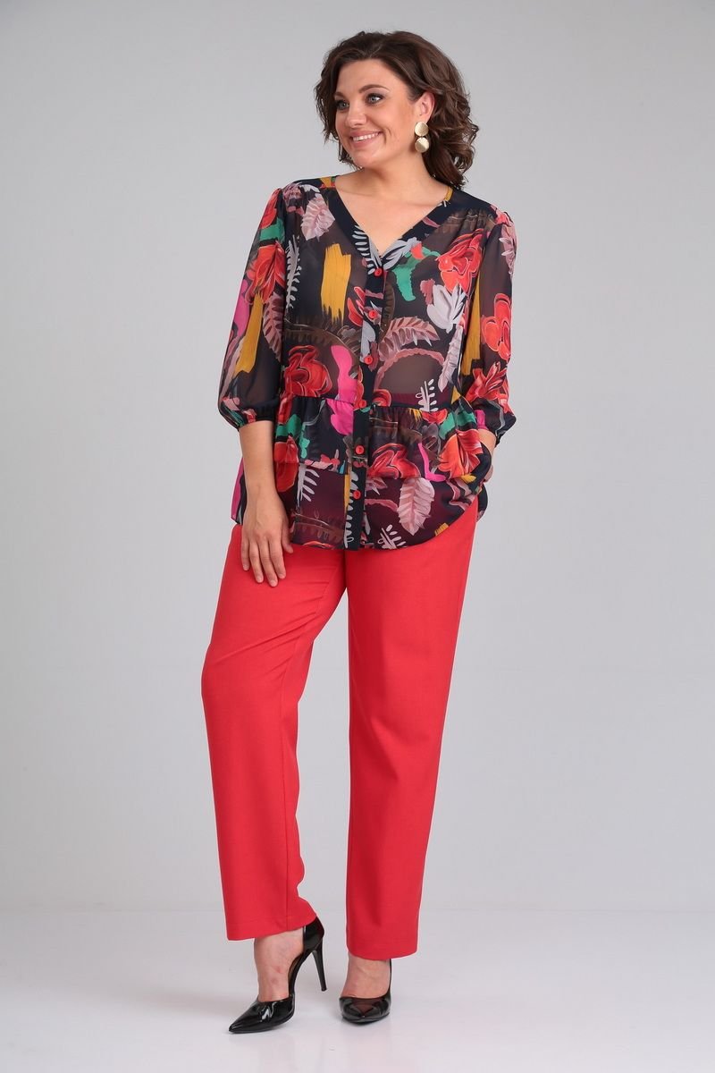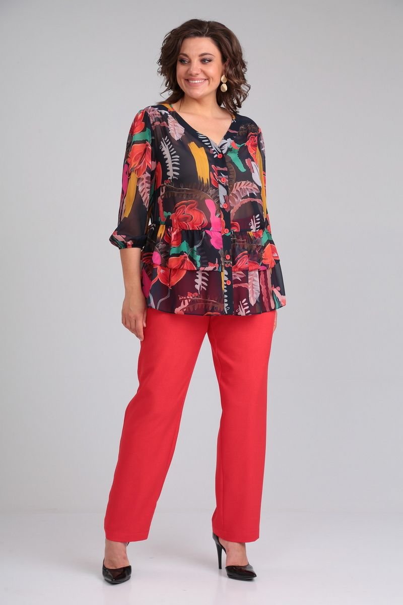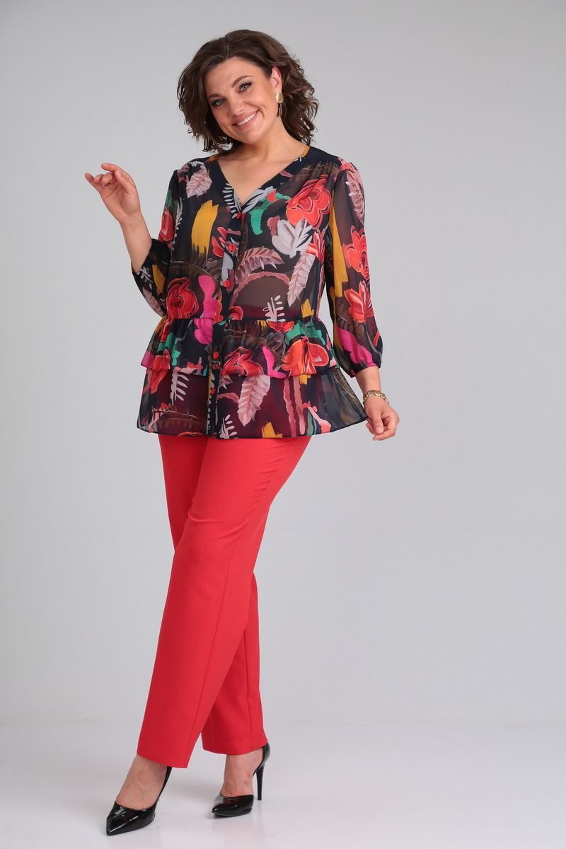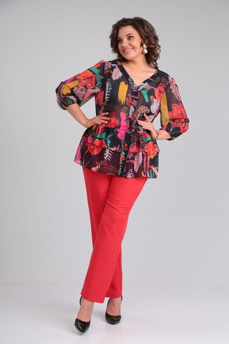 Блуза свободного силуэта, выполненная из легкой шифоновой ткани (не тянется) с модным, красочным принтом. Блуза отрезная чуть ниже линии талии. Верхняя часть переда с нагрудными вытачками, отрезной кокеткой, отрезной планкой. Застежка центральная на петли-пуговицы. Верхняя часть спинки со средним швом. Нижняя часть блузки оформлена двумя ярусами присборенных воланов. Рукав втачной, одношовный со сборкой по окату и резинкой по низу.
