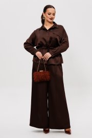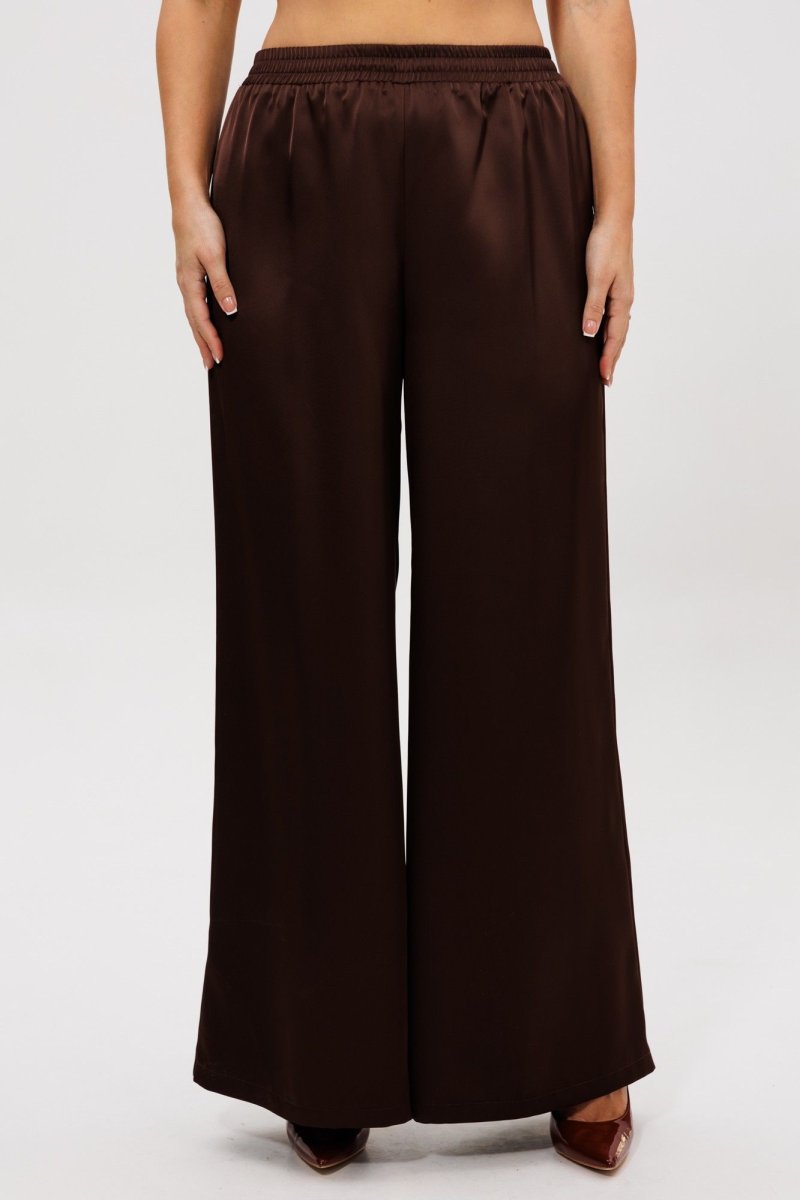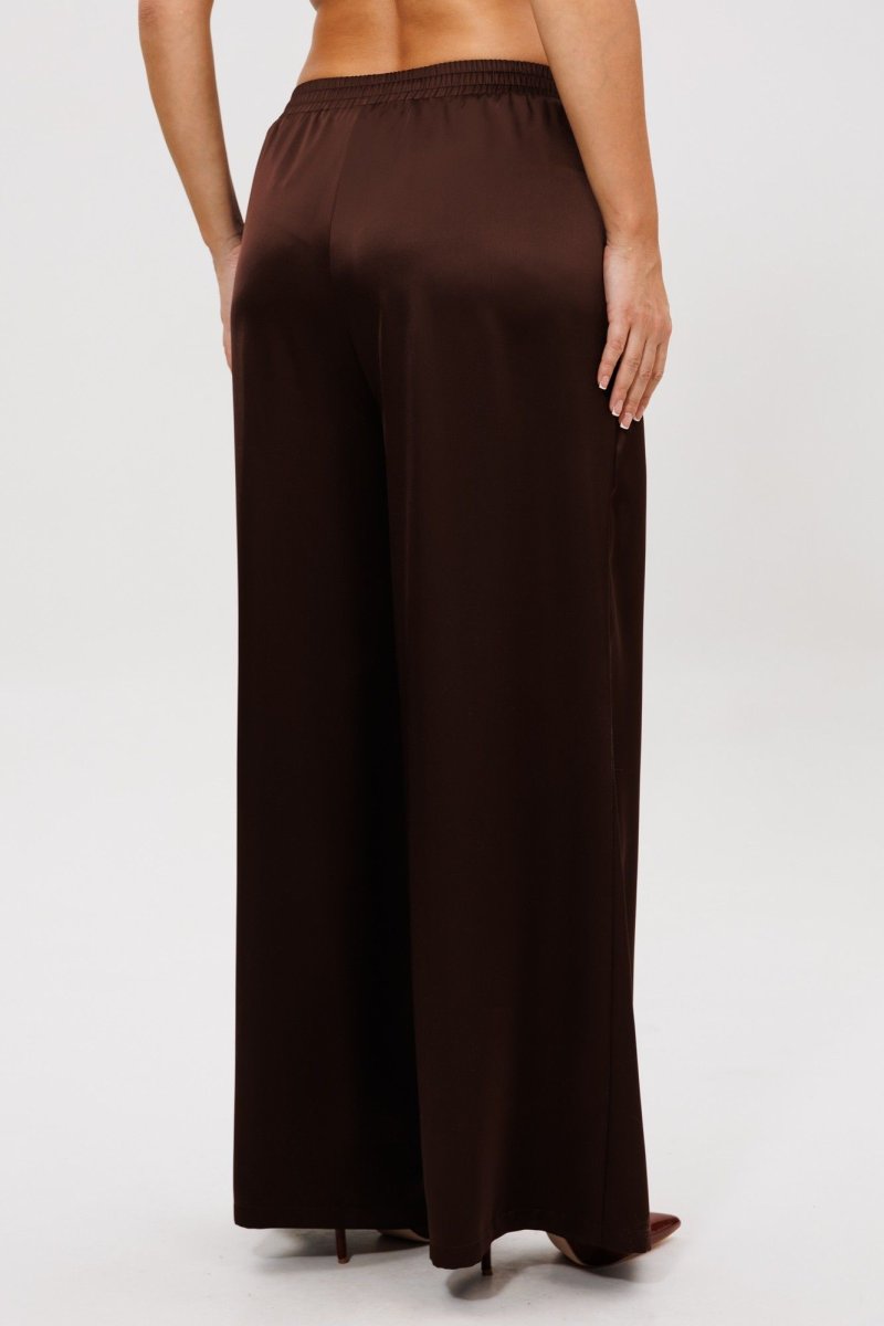 Брюки свободного прямого кроя с высокой посадкой. Верхний срез оформлен поясом с эластичной резинкой.