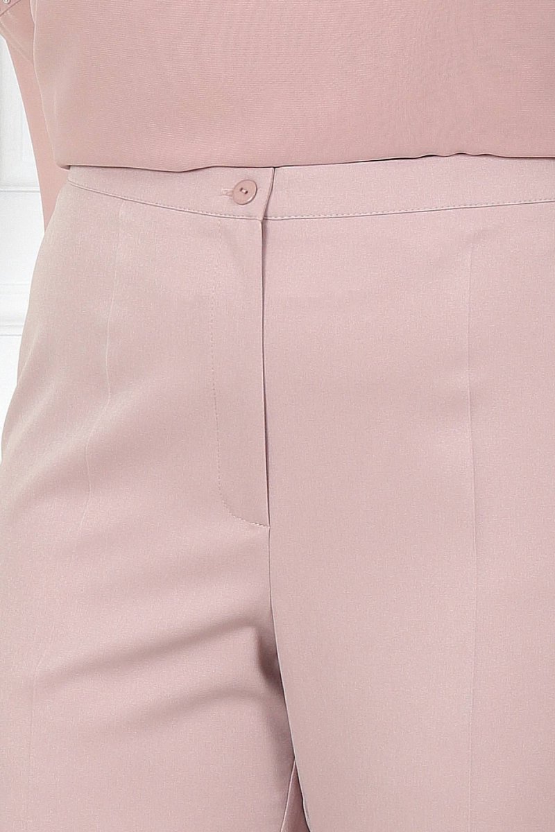 Брюки классические, с посадкой на талии, на притачном поясе, с застёжкой на тесьму-«молния», расположенную в среднем шве передних половинок, 1 петлю и 1 пуговицу на поясе. Задние половинки брюк с талиевыми вытачками, идущими от пояса вниз. Для лучшего прилегания брюк в области талии в поясе со стороны спинки вставлена резинка.