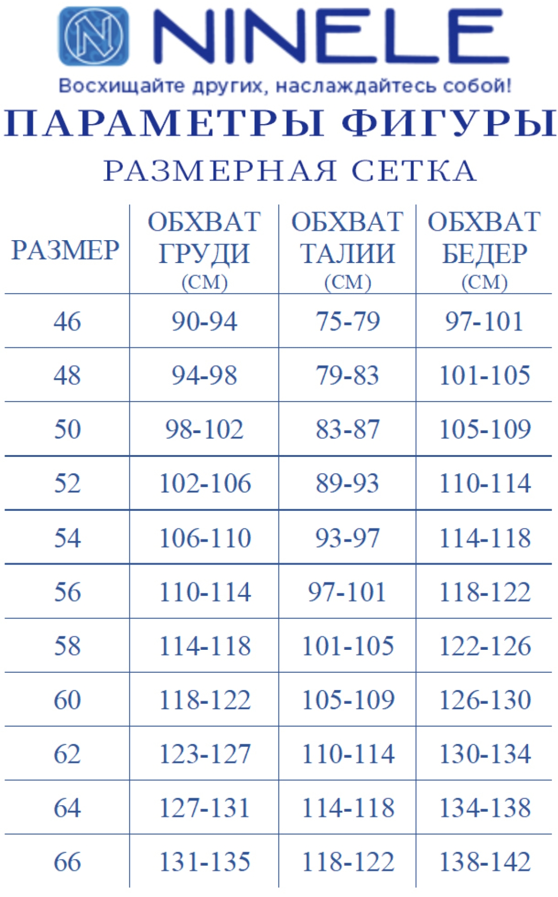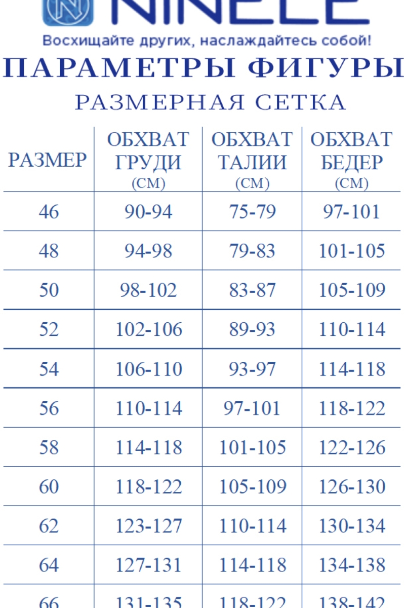 Размер Обхват груди (см) Грудь Обхват талии (см) Талия Обхват бедер (см) Бедра