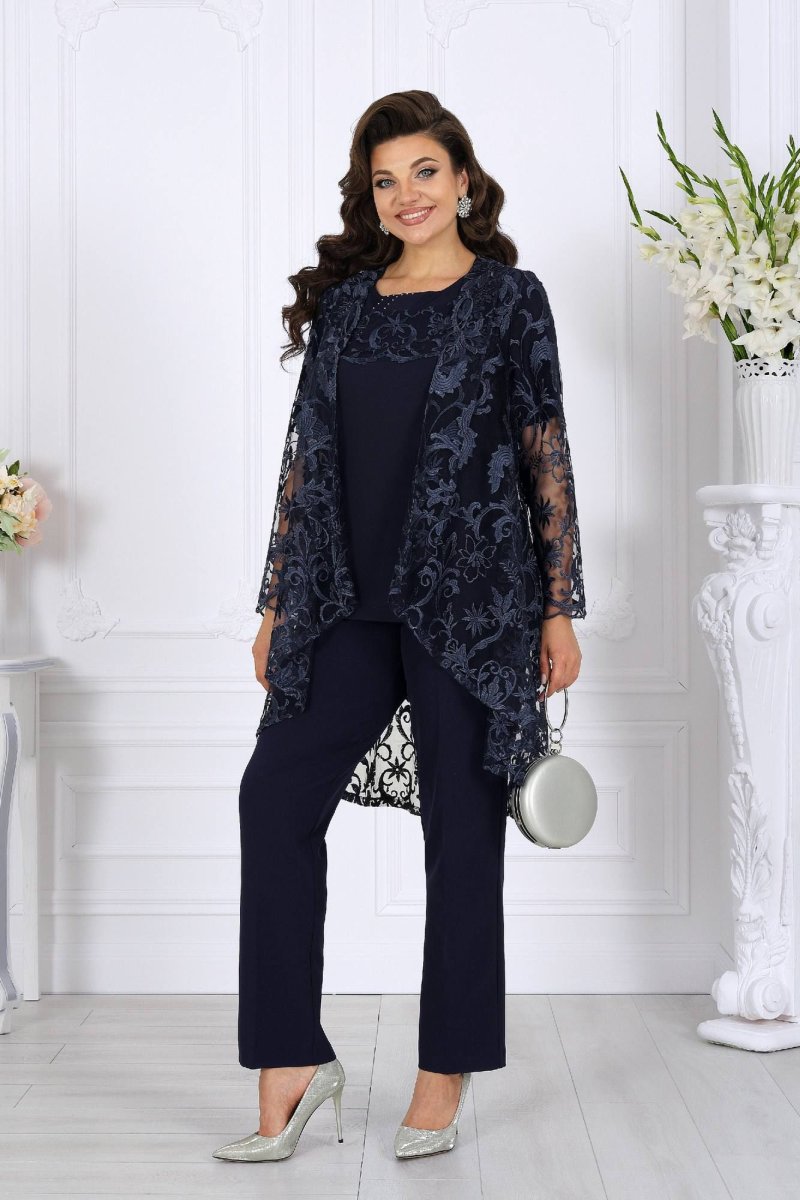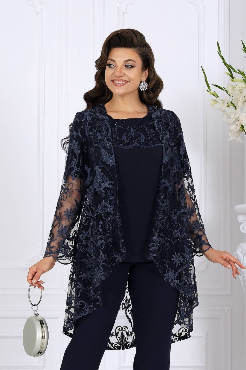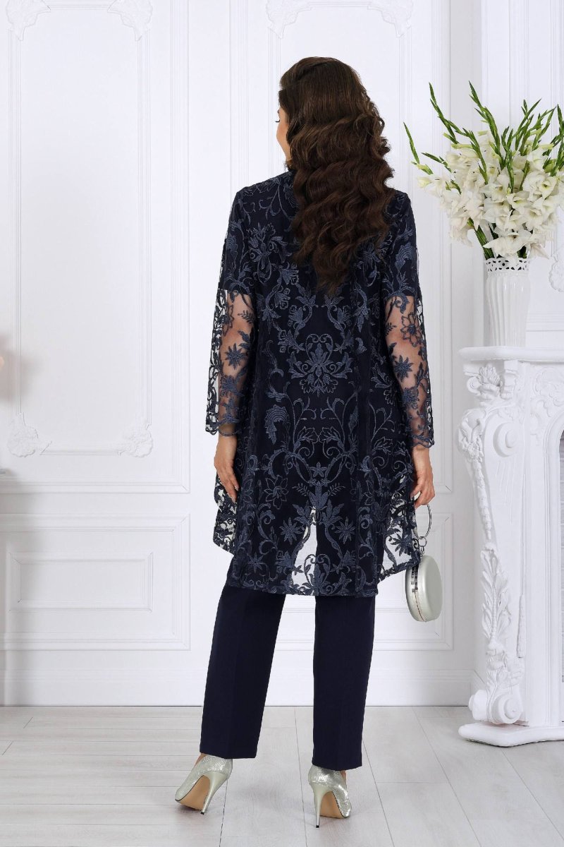 Представляем вам изысканный трех предметный костюм, который станет ярким украшением вашего гардероба на любом торжественном событии, будь то вечеринка, корпоратив, свадебное торжество или юбилей. Комплект брючный 3-х предметный, состоящий из кардигана, блузки и брюк. Кардиган выполнен из гипюра, силуэта "трапеция". Длина асимметричная: по переду короче, длиннее к середине спинки. Длина кардигана по посередине спинки 108,0 см. Линия горловины и борта оформлены отложным воротником-шалью. Рукава втачные, одношовные, длиной 59 см, по низу оформлены фестонами. Блузка выполнена из трикотажного полотна "масло", полуприлегающего силуэта, длиной по середине спинки 73.5 см. Перед с нагрудными вытачками, идущими от пройм, с настрочной кокеткой из гипюра, с фигурным низом. Спинка с талиевыми вытачками. Вырез горловины спинки и переда округлый, по переду с подрезной планкой, декорированной стразами. Рукава втачные, одношовные, длиной 27 см.