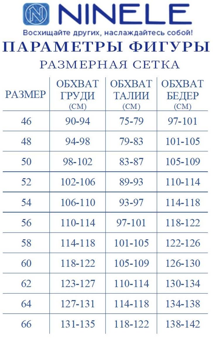 Размер Обхват груди (см) Грудь Обхват талии (см) Талия Обхват бедер (см) Бедра