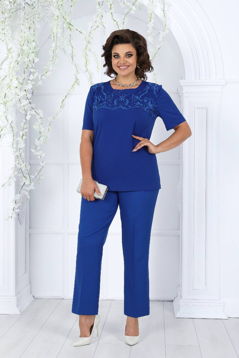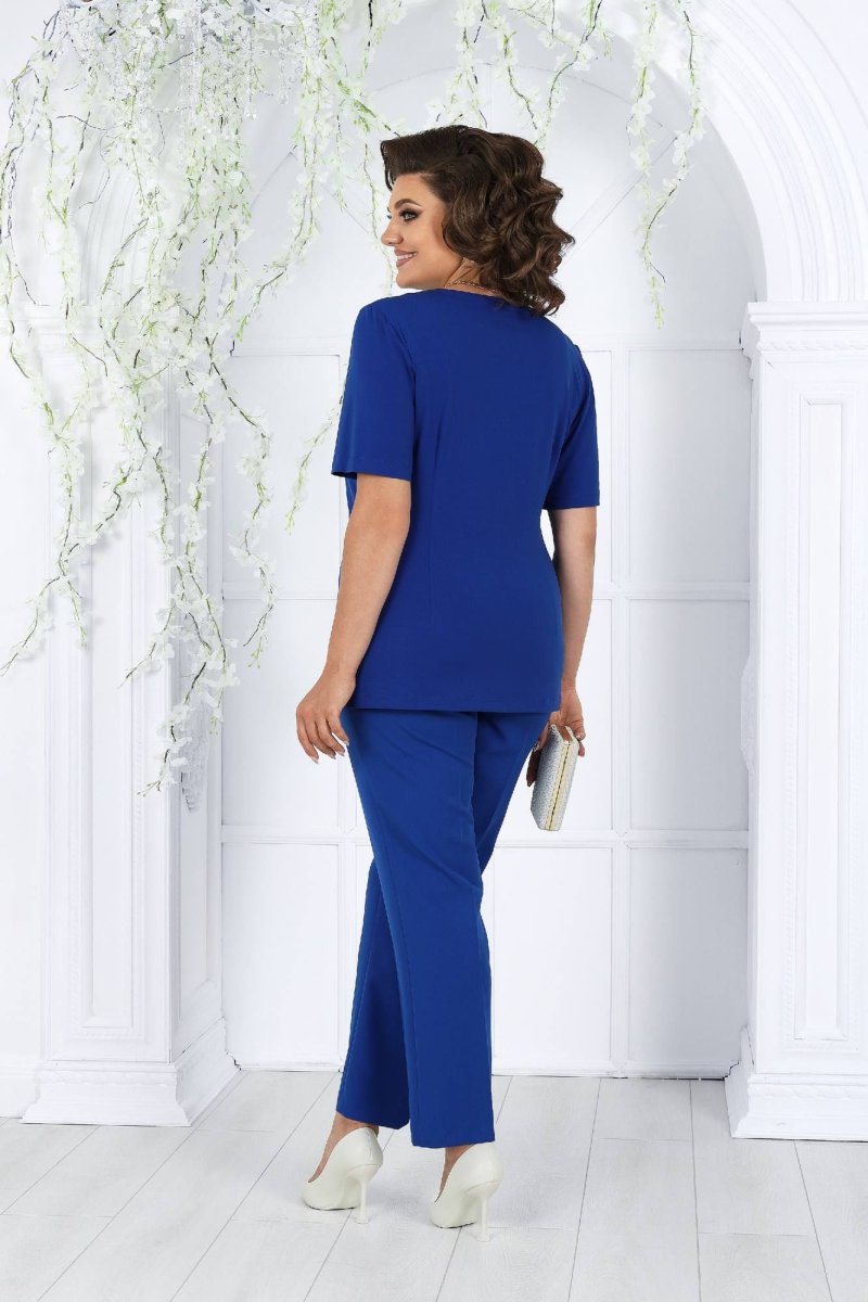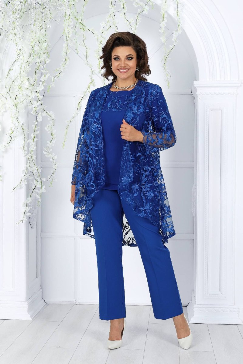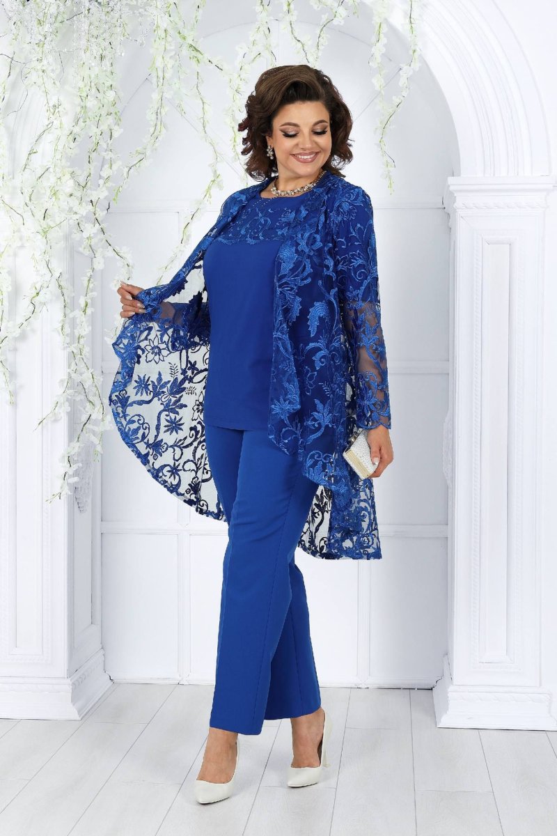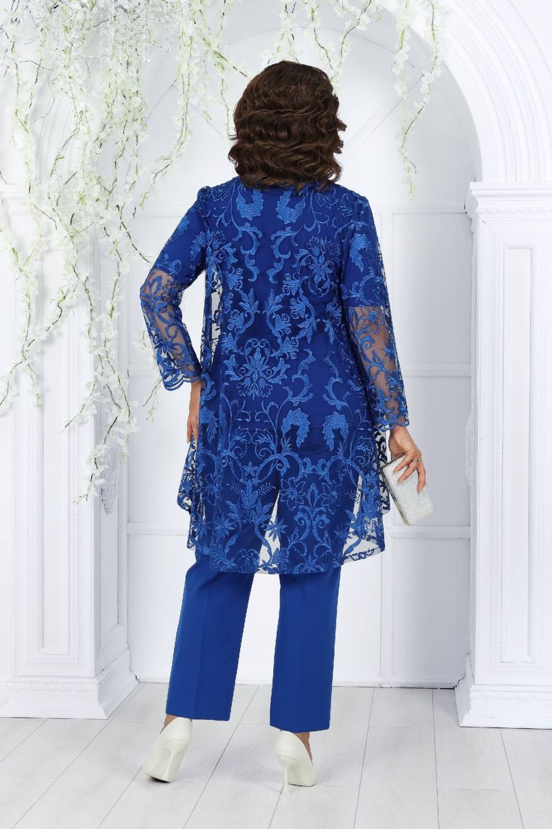 Представляем вам изысканный трех предметный костюм, который станет ярким украшением вашего гардероба на любом торжественном событии, будь то вечеринка, корпоратив, свадебное торжество или юбилей. Комплект брючный 3-х предметный, состоящий из кардигана, блузки и брюк. Кардиган выполнен из гипюра, силуэта "трапеция". Длина асимметричная: по переду короче, длиннее к середине спинки. Длина кардигана по посередине спинки 108,0 см. Линия горловины и борта оформлены отложным воротником-шалью. Рукава втачные, одношовные, длиной 59 см, по низу оформлены фестонами. Блузка выполнена из трикотажного полотна "масло", полуприлегающего силуэта, длиной по середине спинки 73.5 см. Перед с нагрудными вытачками, идущими от пройм, с настрочной кокеткой из гипюра, с фигурным низом. Спинка с талиевыми вытачками. Вырез горловины спинки и переда округлый, по переду с подрезной планкой, декорированной стразами. Рукава втачные, одношовные, длиной 27 см.