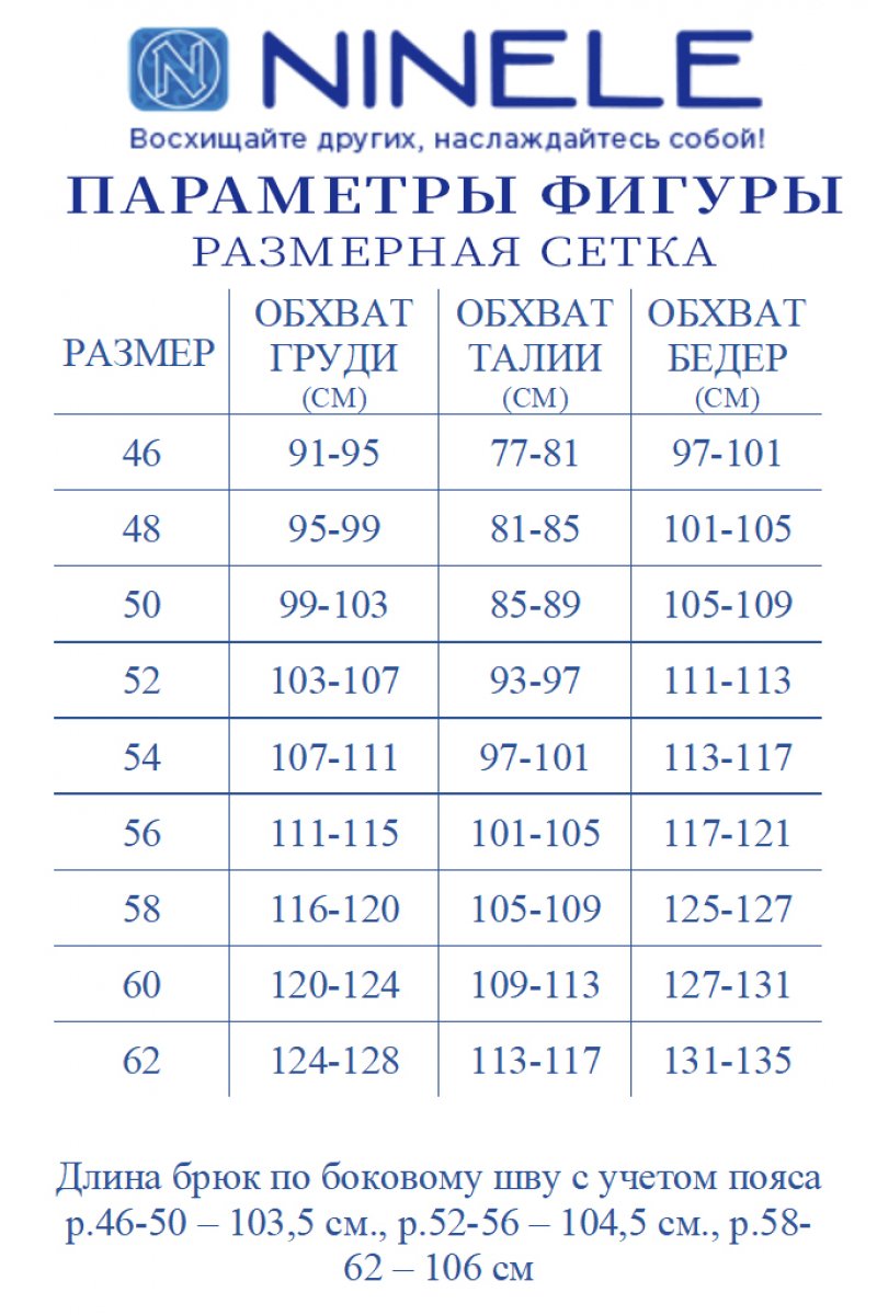 Брюки классические, с посадкой на талии, на притачном поясе, с застёжкой на тесьму-«молния», расположенную в среднем шве передних половинок, и 1 петлю и 1 пуговицу на поясе. Задние половинки брюк с талиевыми вытачками, идущими от пояса вниз, с наклонными карманами на передних половинках, с заутюженными стрелками на передних и задних половинках. Для лучшего прилегания брюк в области талии в поясе со стороны спинки вставлена резинка.