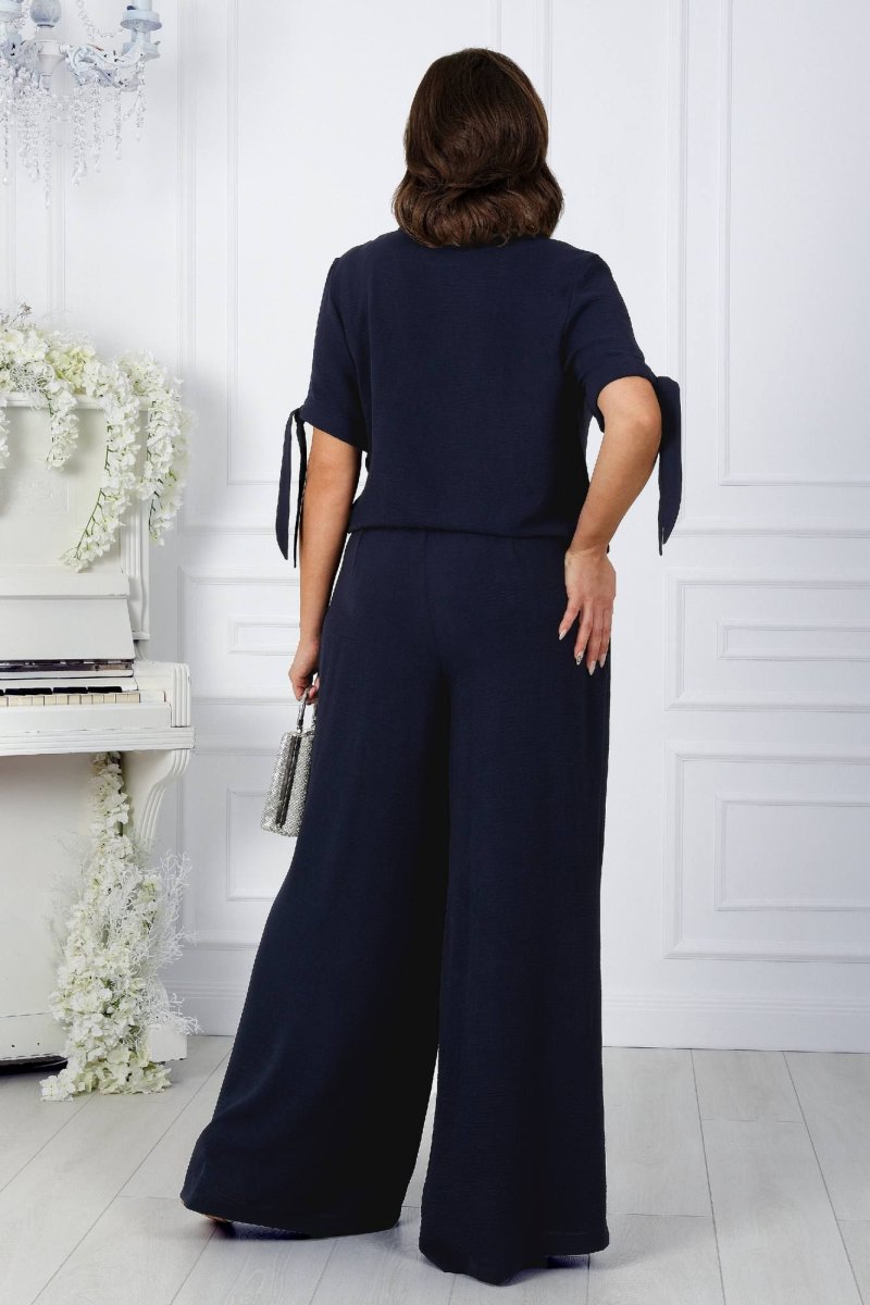 Брюки с посадкой на талии, прямые к низу от бедра, на притачном поясе, с застёжкой на потайную тесьму-«молния», расположенную в левом боковом шве. Передние половинки брюк с встречной застроченной на 15 см складкой, идущей от пояса вниз. Задние половинки брюк с талиевыми вытачками, идущими от пояса вниз. Для лучшего прилегания брюк в области талии в поясе частично со стороны спинки вставлена резинка.