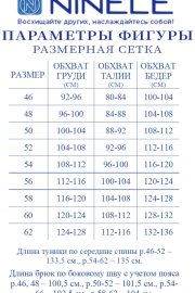 Туника полуприлегающего силуэта, выполнена из костюмно-плательного сатина. Модель без подкладки, с плечевыми накладками. Перед с нагрудными вытачками, направленными от пройм, и средним швом, в нижней части которого обработан разрез. Спинка с талиевыми вытачками и средним швом, в верхней части которого расположена застежка на потайную тесьму-«молнию», в нижней части-разрез. Ширина отделочной строчки по центральным разрезам переда и спинки – 4 см. В боковых швах высокие разрезы расположены от уровня талии до низа. Ширина отделочной строчки по боковым разрезам – 1 см. V-образный вырез горловины переда переходит в округлый по спинке. Рукав втачной, с асимметричным обтачным воланом по низу. Туника дополняется съемным декоративным цветком «роза», выполненным из основной ткани. Длина туники – 133,5 см (46-52 р-р), 135 см (54-62 р-р).
