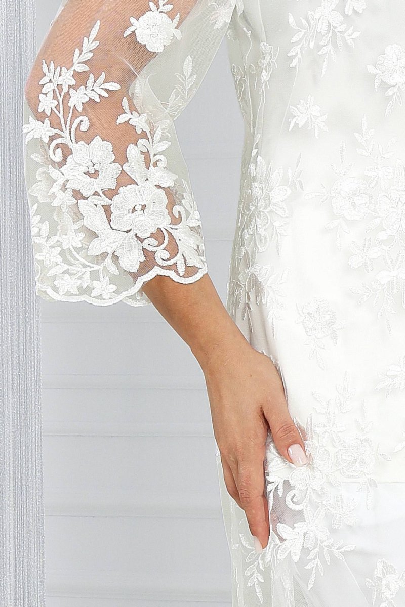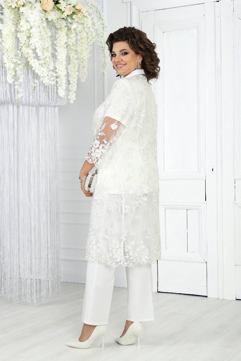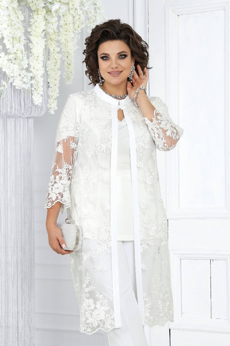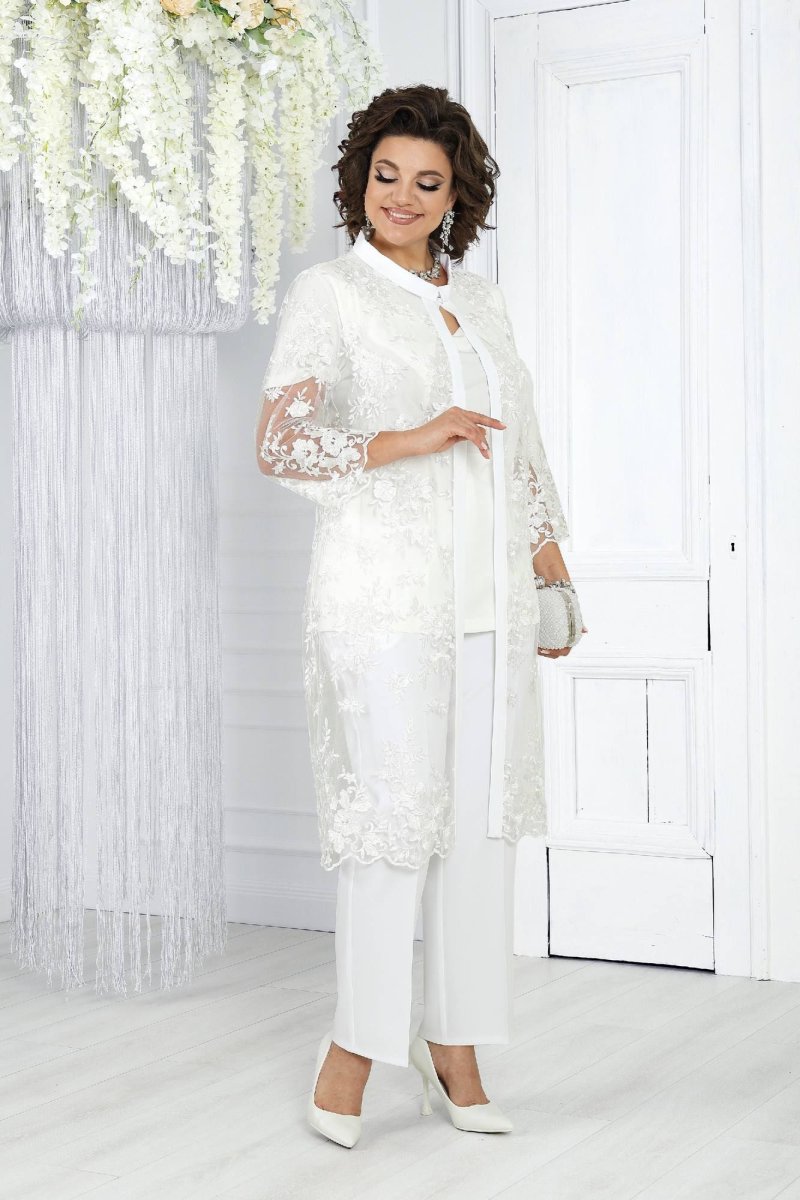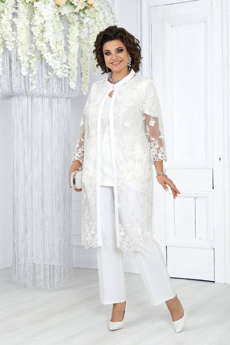 Комплект брючный 3-х предметный, состоящий из кардигана, выполненного из гипюра, джемпера, выполненного из трикотажного полотна «масло» и брюк, выполненных из костюмно-плательной ткани.